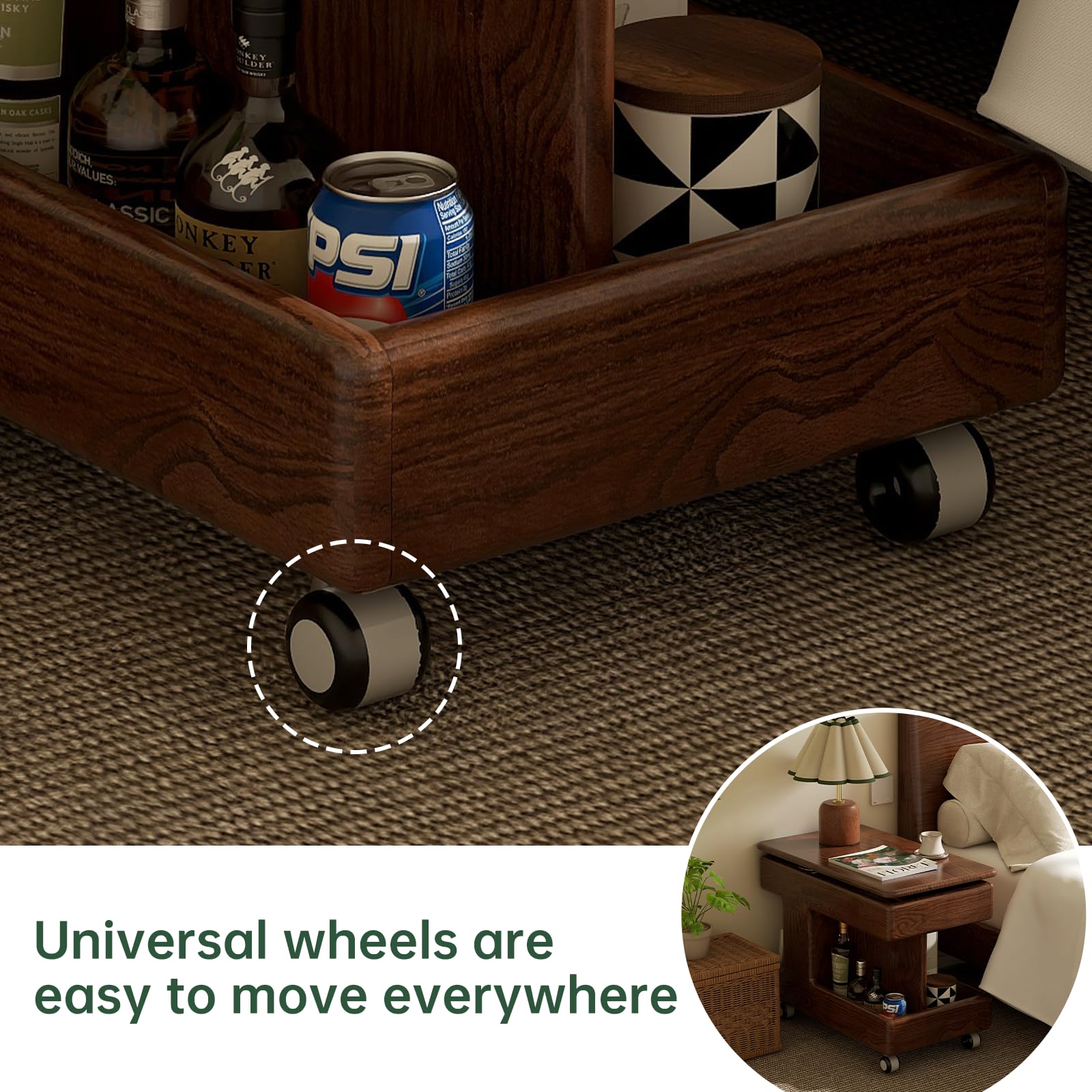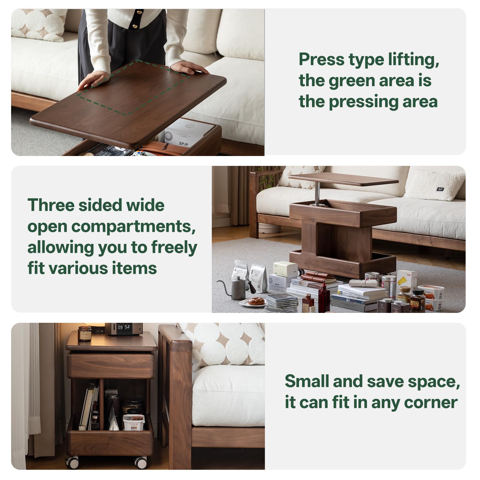 100% Solid Wood Lift Top Coffee Table with Storage, Small Bedside Table with Wheels and Rotating Desktop, Transform Coffee Table for Living Room, Recliner and Small Places(Walnut, No Need to Install)