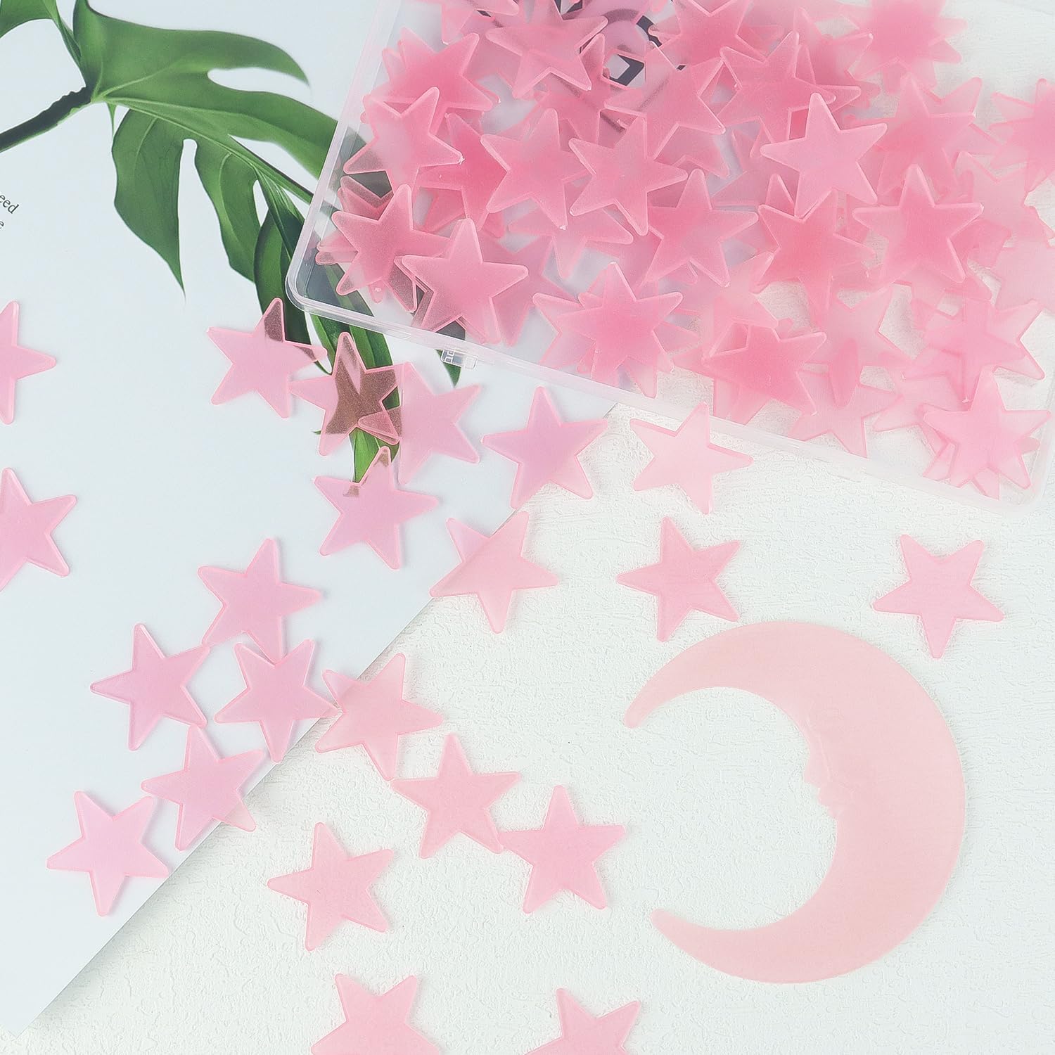 100 Stars and 1 Moon Glow in The Dark Luminous Fluorescent 3D Plastic Glow Stars Moon for Ceiling, Glowing Wall Stickers Create a Realistic Starry Sky, Room Decorations (Pink)