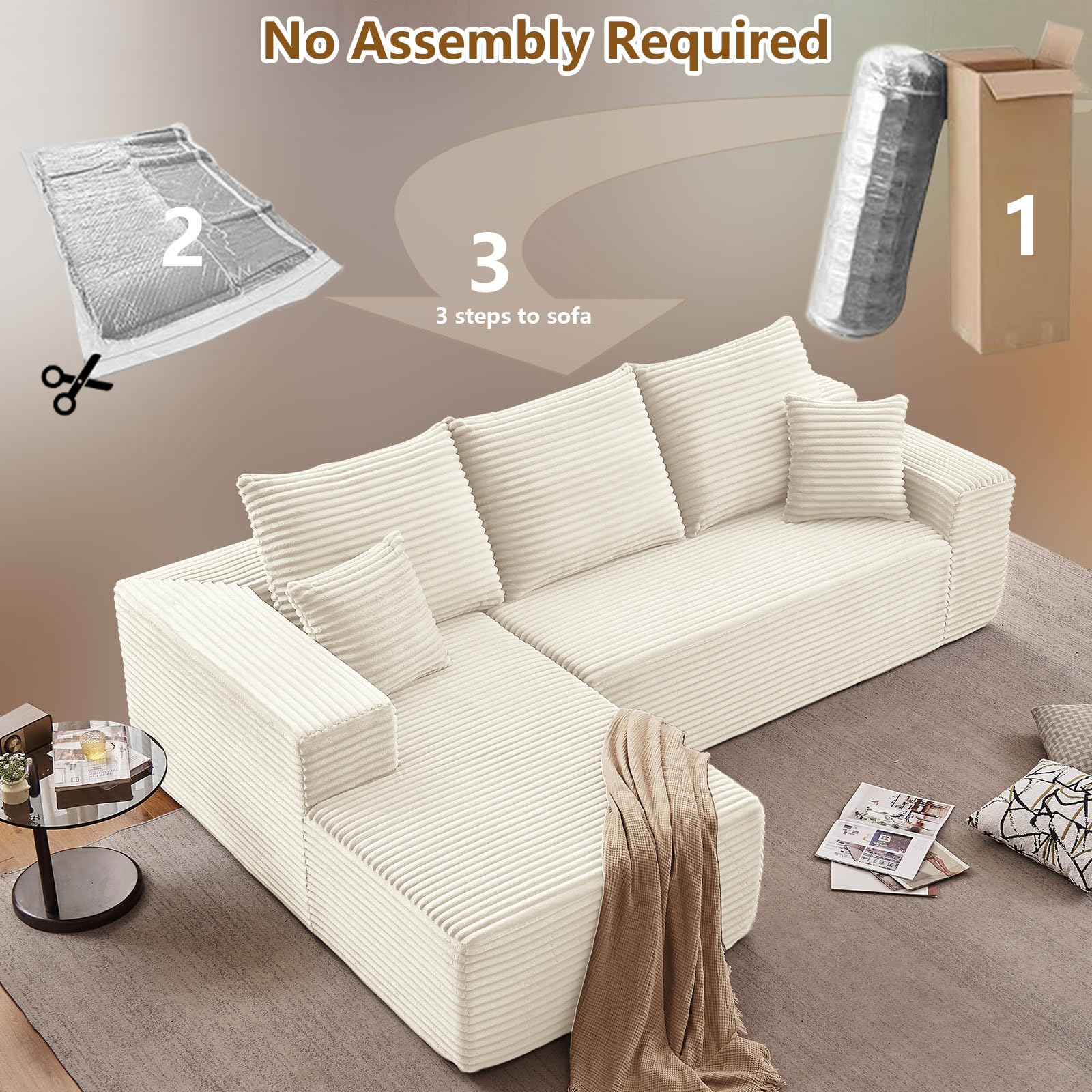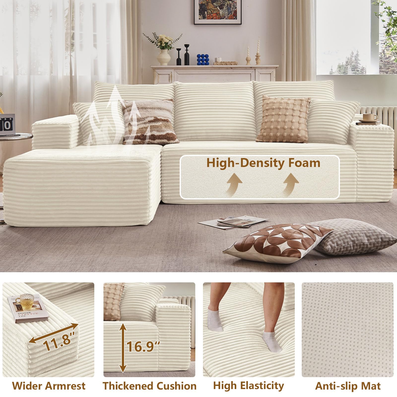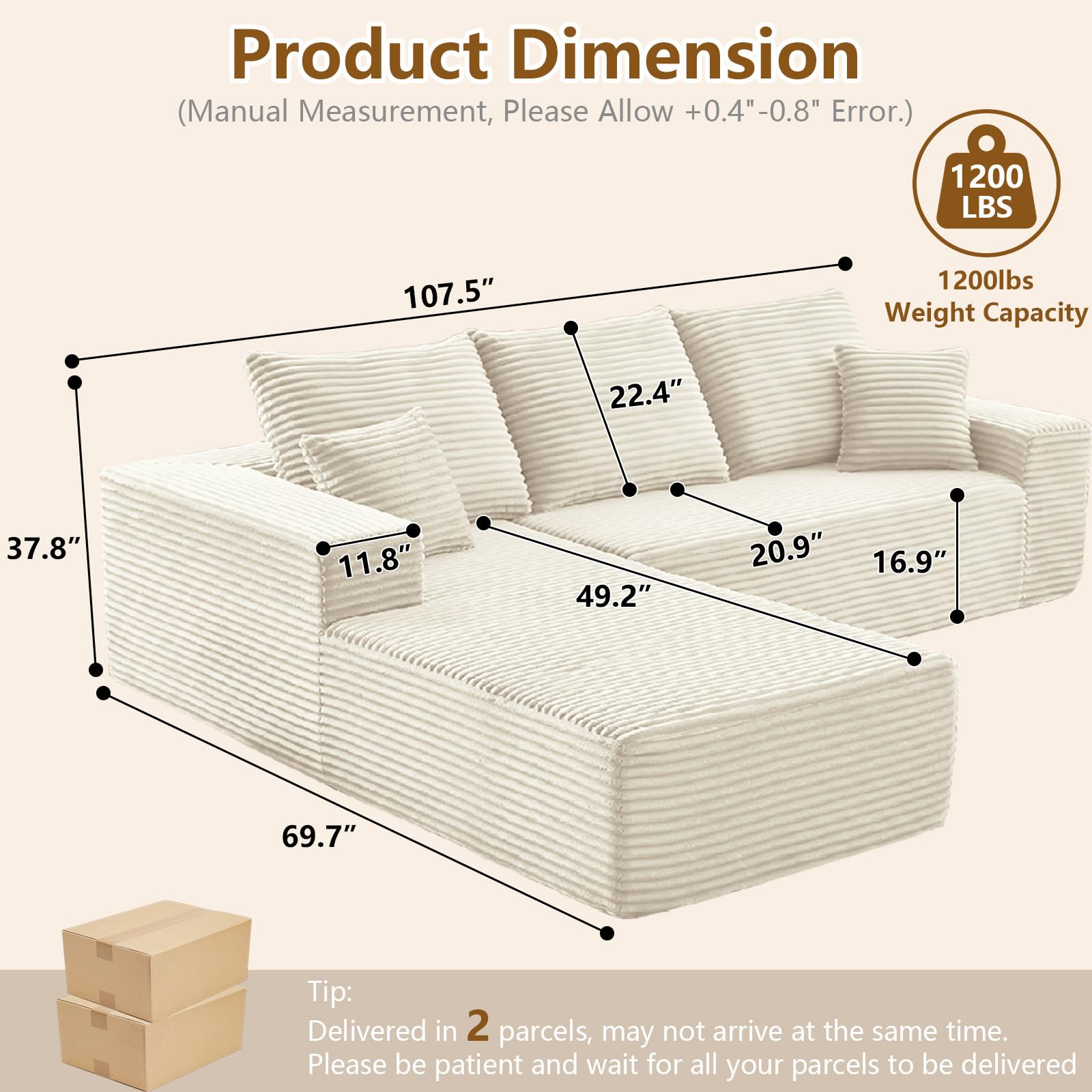 107" Cloud Sectional Couch with L-Shape Chaise, Modern Modular Comfy Sofa with Deep Seat, Upholstered Corduroy Couches Sleeper Chaise Longue for Living Room Bedroom, No Assembly Required, White