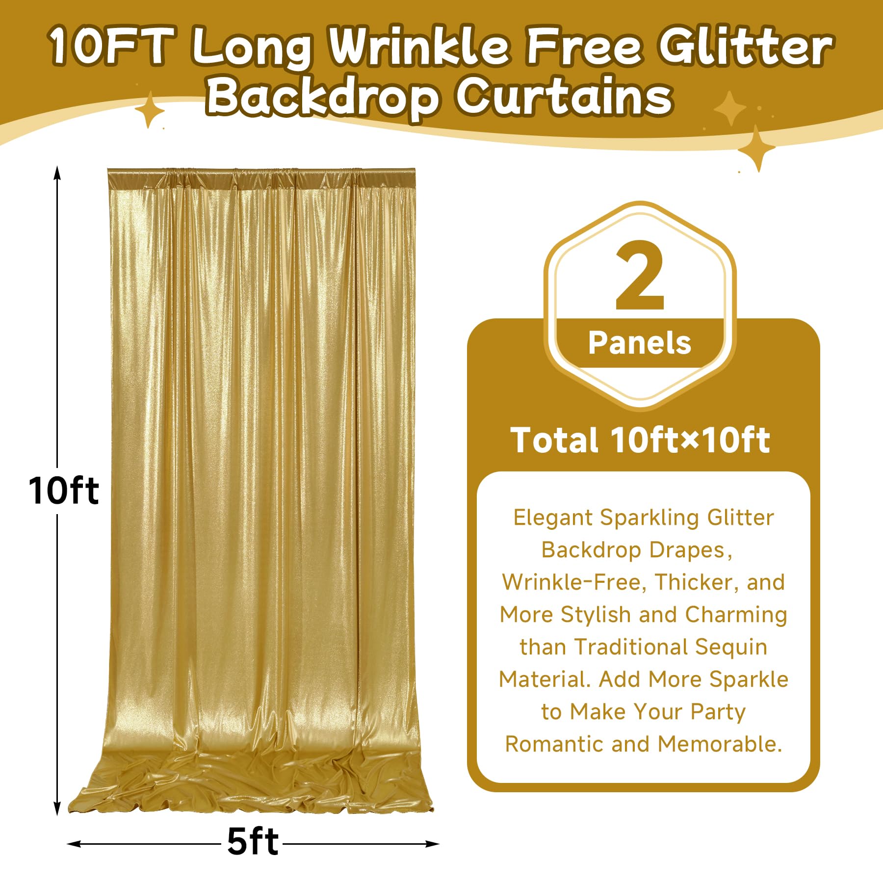 - Not See Through 10FT Sequin Glitter Drape Curtains:Your package will come with 2 panels gold sequin glitter photography backdrop drapes. Each gold background panels measures 5ft width and 10ft height.Entire backdrop curtain measures 10ft x 10ft.