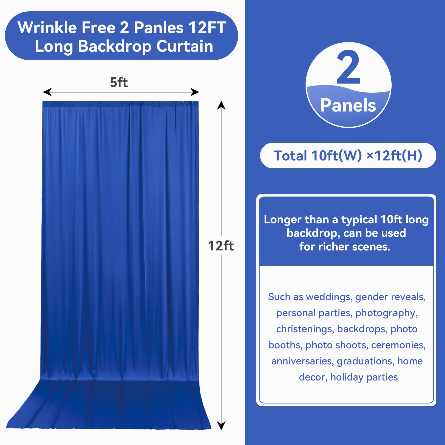 - Package Icluding:5ft(W) x 12ft(H), 2 panels, total 10ft(W) x 12ft(H). Our 12ft wedding Royal Blue backdrop dcurtain is longer than the typical 10ft long backdrop curtain,draping more beautiful. And can be used for richer scenes because it allows us have more room to build a party scene.