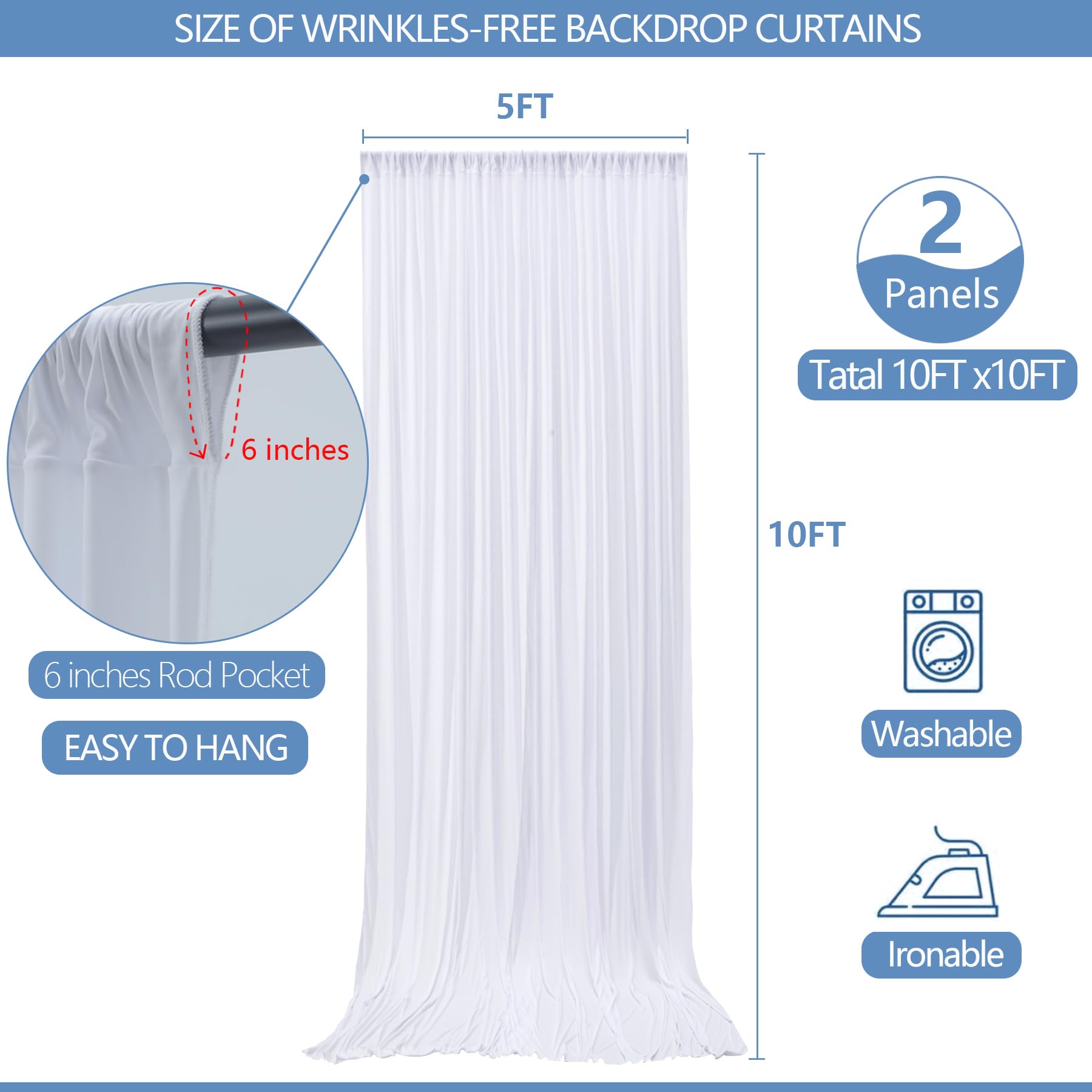 - 2 Panels Backdrop Curtains Package —— Your package includes 2 panels of soft white backdrop curtains, each measuring 5FT in width and 10FT in height. Together, they create a perfect 10FT x 10FT backdrop, providing ample room for various occasions. Please note: Not including the background stand