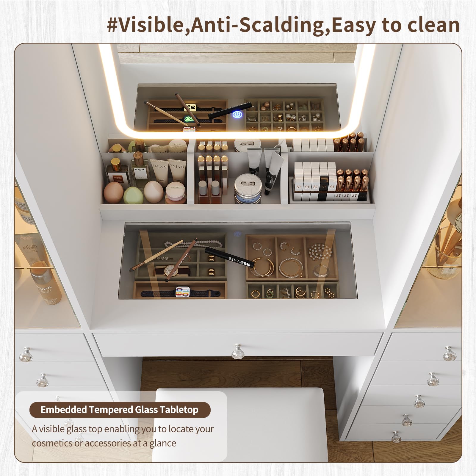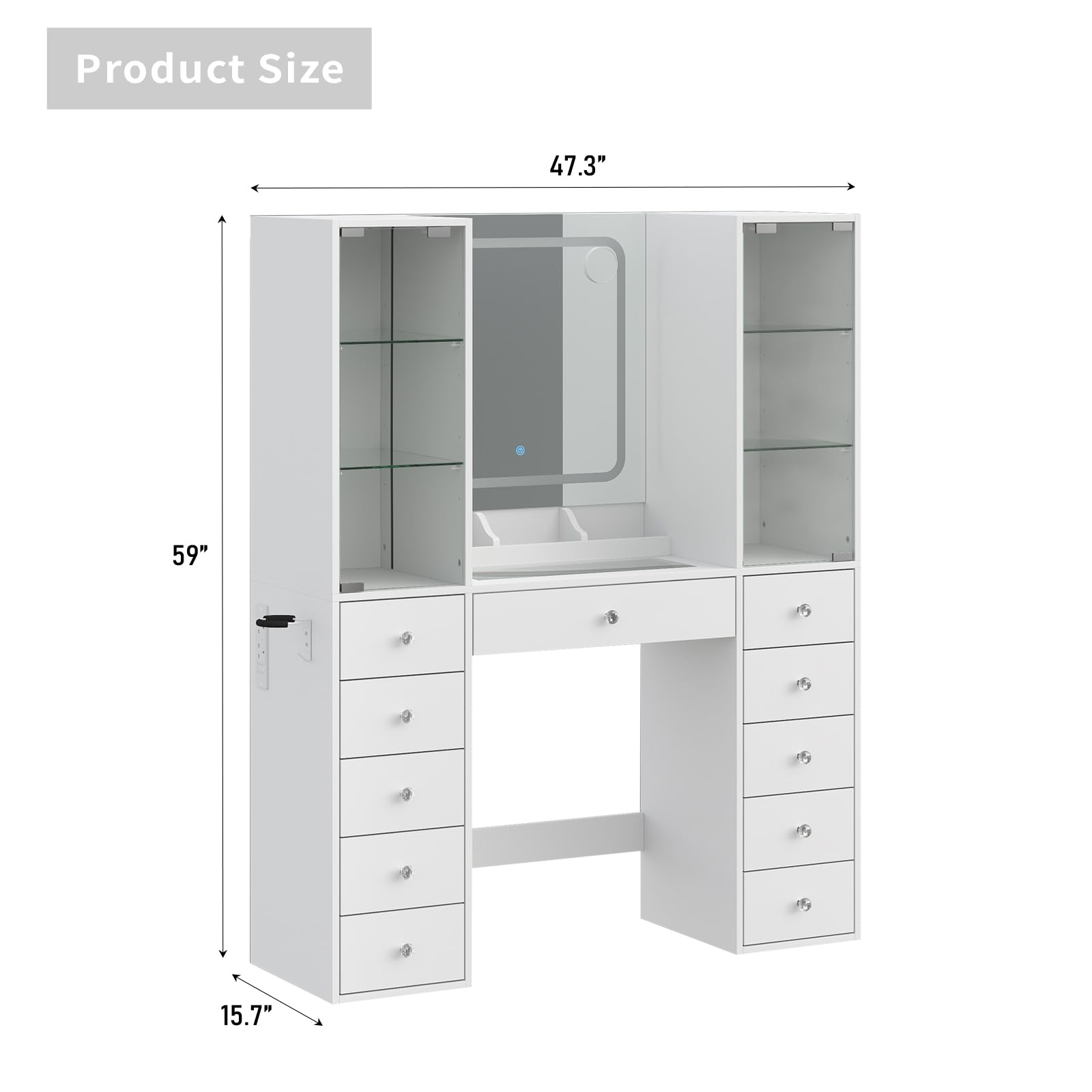 - Massive Storage & Sleek Organization: Never clutter your space again! 11 large makeup sliding drawers and 2 lighted storage cabinets make your makeup environment well-organized, there are adjustable shelves inside the cabinets, you can adjust according to your needs. This vanity can hold all your cosmetics perfectly! Keeping everything visible and within reach
