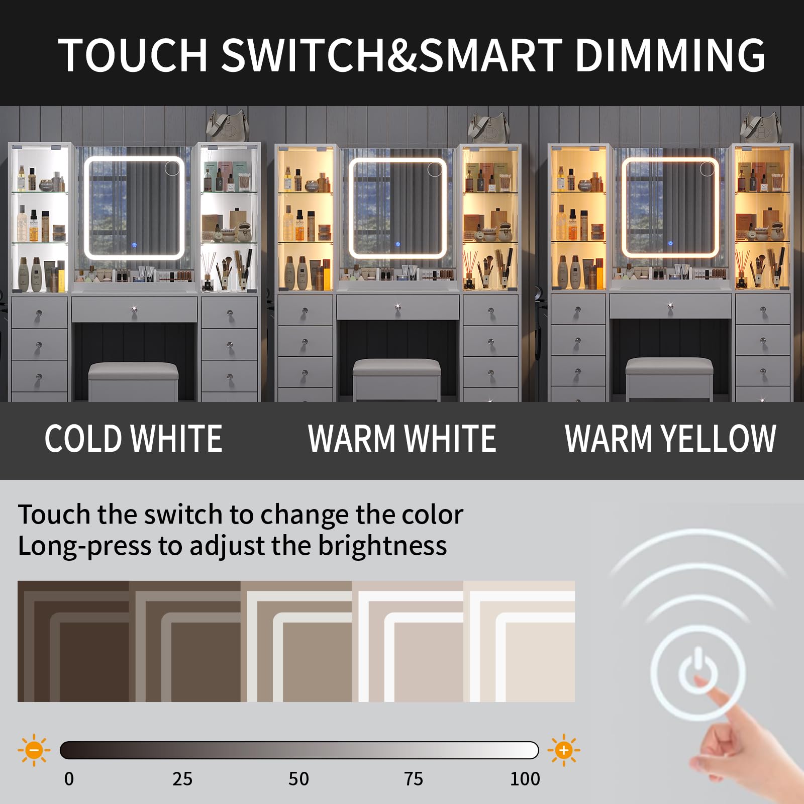 - Smart LED Lighting : Get studio-quality illumination with touch-sensitive controls. Choose from 3 lighting modes (cold light/natural light/warm light) and adjust brightness, 120 high-efficiency LED beads deliver perfect, shadow-free illumination for makeup and styling