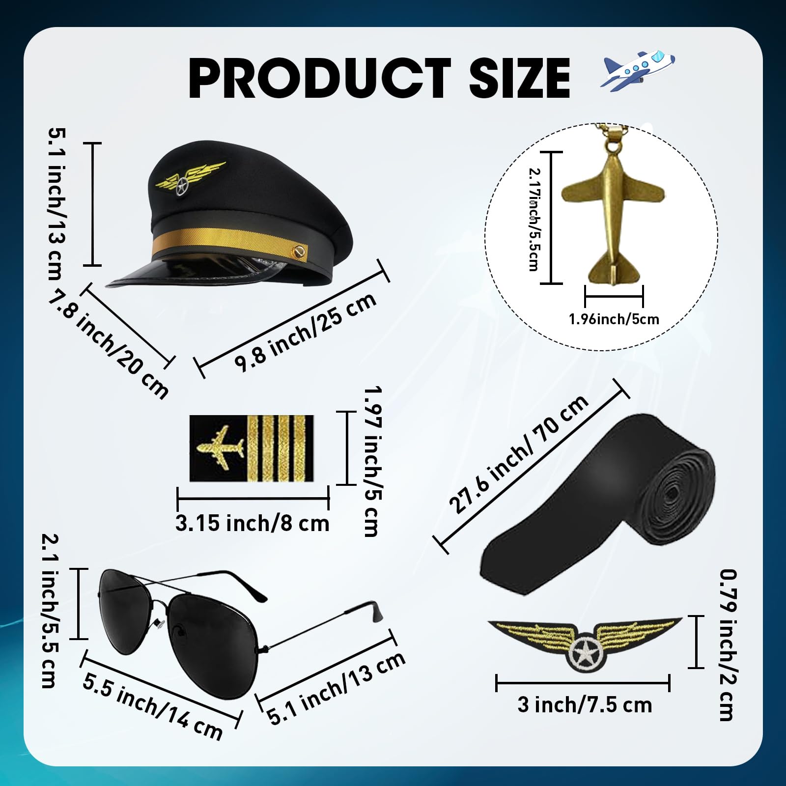 - Pilot Accessories Set: The pilot costume set includes 1x Hat, 1x Tie, 1x Necklace, 1x Sunglasses, 1x Pilot Epaulettes (Shoulder Straps), and 1x Embroidered Badge. This complete collection of pilot uniform accessories provides a dashing look, allowing you to feel like a true pilot and immerse yourself in the authentic flying experience