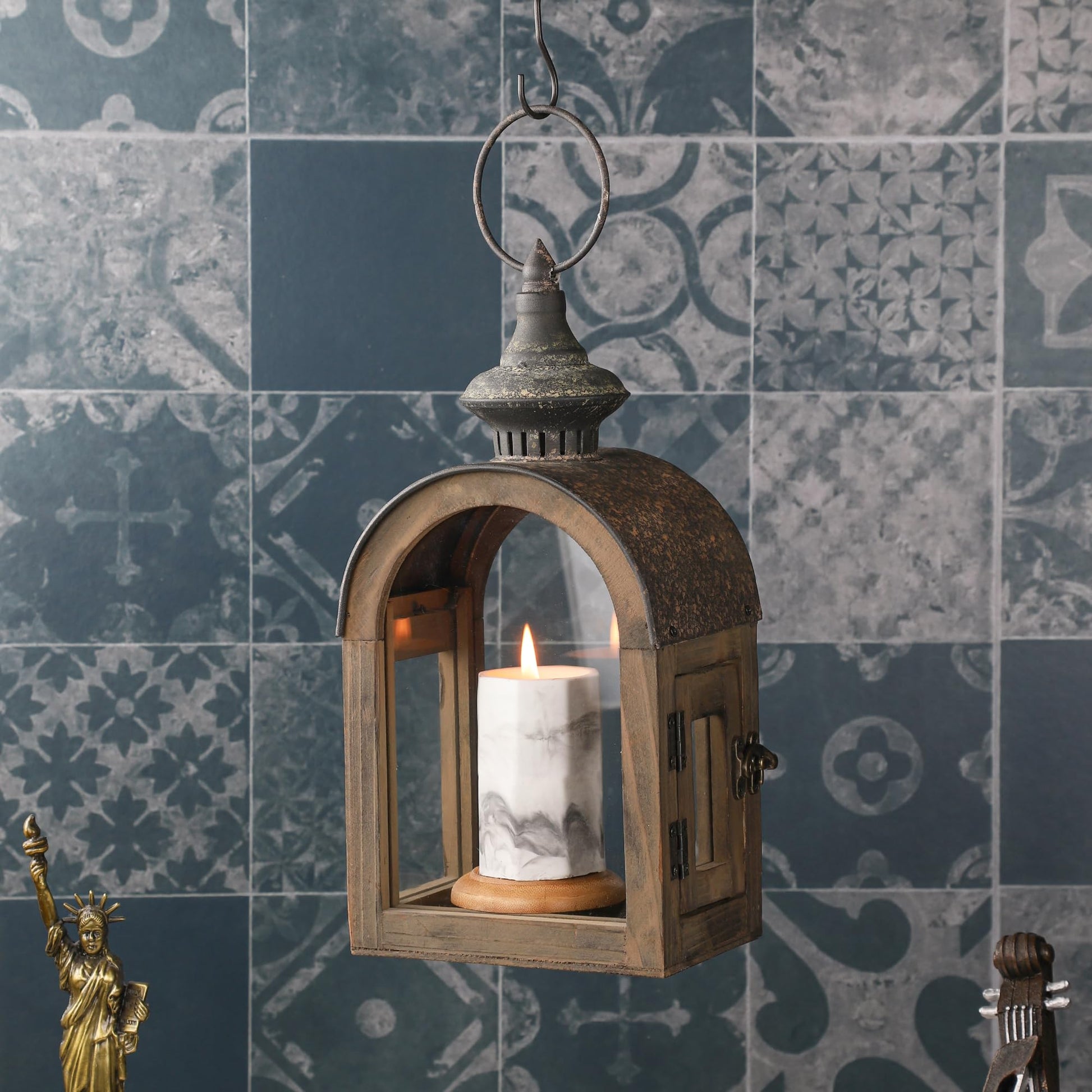 Details: 12" High Wooden Dome Lantern Made of Solid Fir Wood and Real Glass in Rustic Brown Finish with Rustic Metal Top, Hurricane Lantern, Farmhouse Lantern