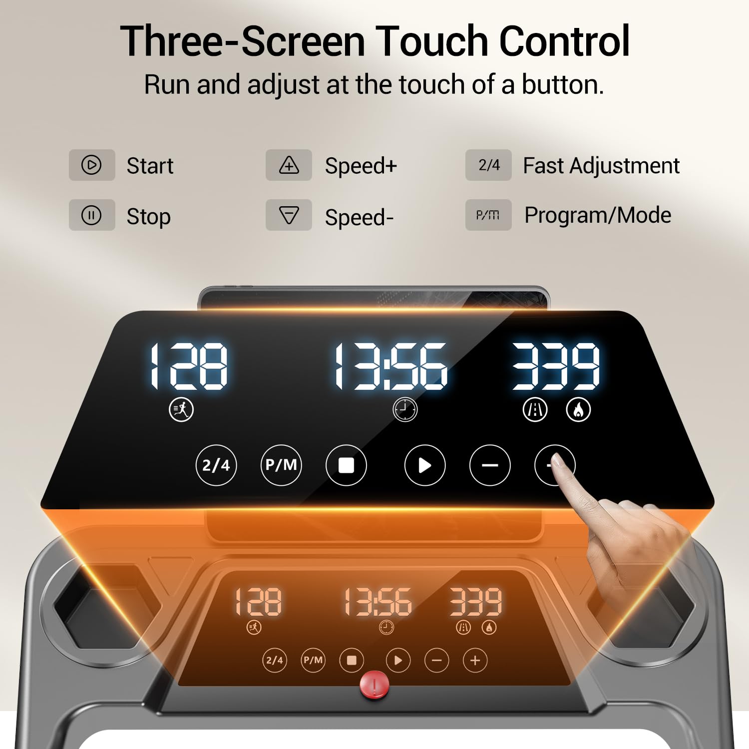 - 3-Screen Display & Foldable Design: This treadmill with handles features a triple display that shows time, speed, distance, and calories burned in real time and allows you to improve and adjust your workout program at any time with buttons on the display. This foldable treadmill has a built-in water cup holder and tablet/cell phone holder, making it easy for users to place their belongings while working out