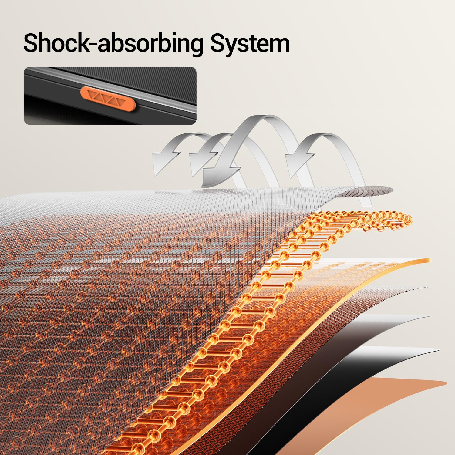 - Spacious Running Belt: 38.2“ x 15.2” Running belt is equipped with 6 layers of non-slip surface, cushioning rubber pads and silicone shock absorbers, the running belt will not shift to ensure a smooth and comfortable run, absorbs shock generated during running, reduces impact on joints and muscles, extends the duration of the workout, and improves workout results