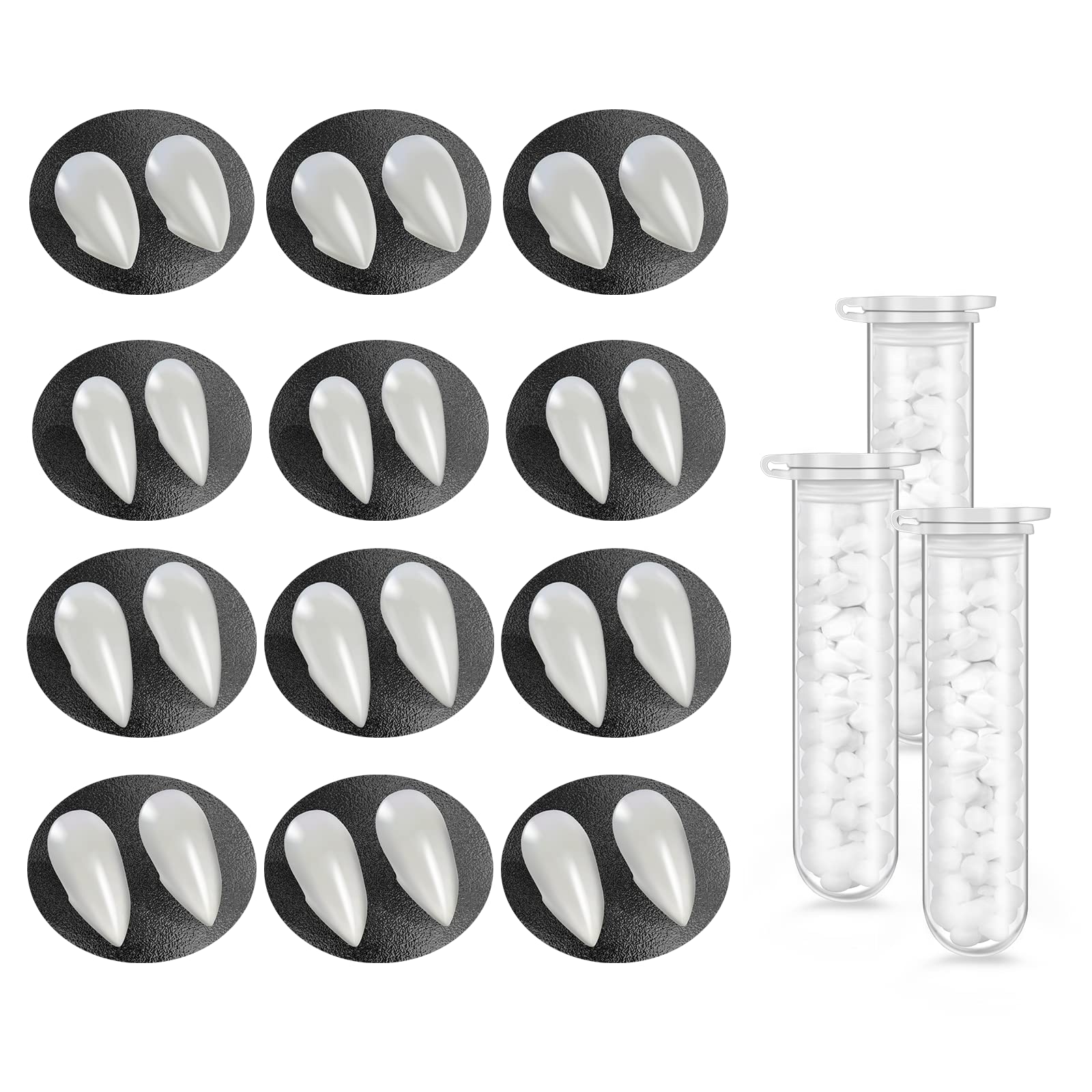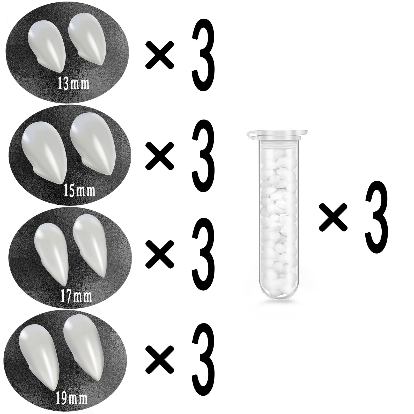 - Sufficient Packaging: You will get 12 different pairs vampire fangs(sizes:3x13mm/3x15mm/3x17mm/3x19mm ) and 3 tube solid teeth adhesive(disposable), meet all your size need.