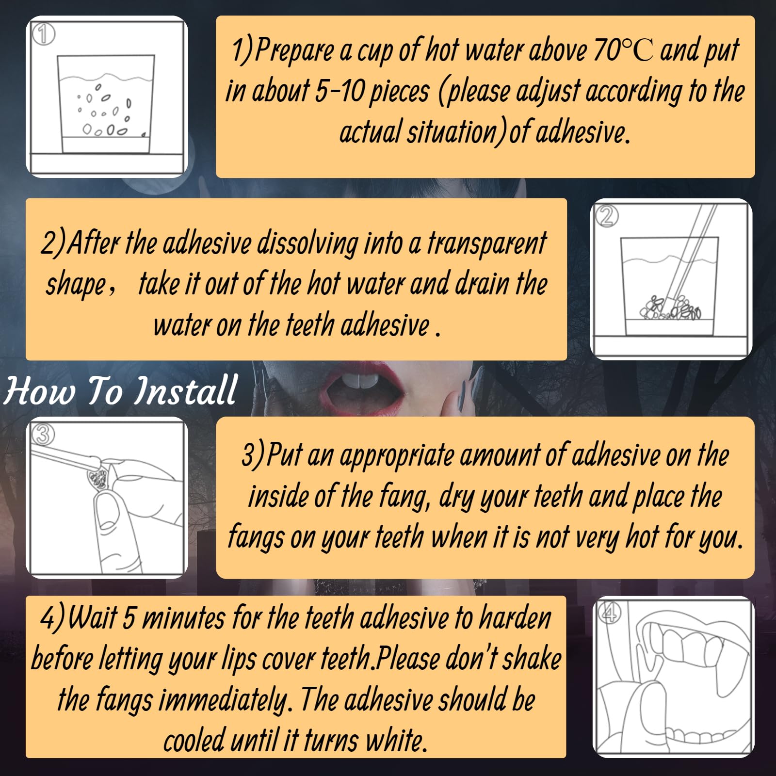 - Easy To Use Vampire Fangs: Heat the teeth adhesive beads from white to clear by hot water, then drain the water and press adhesive into the fang, then dry your teeth and place the fangs on your teeth. See attached instructions for details.