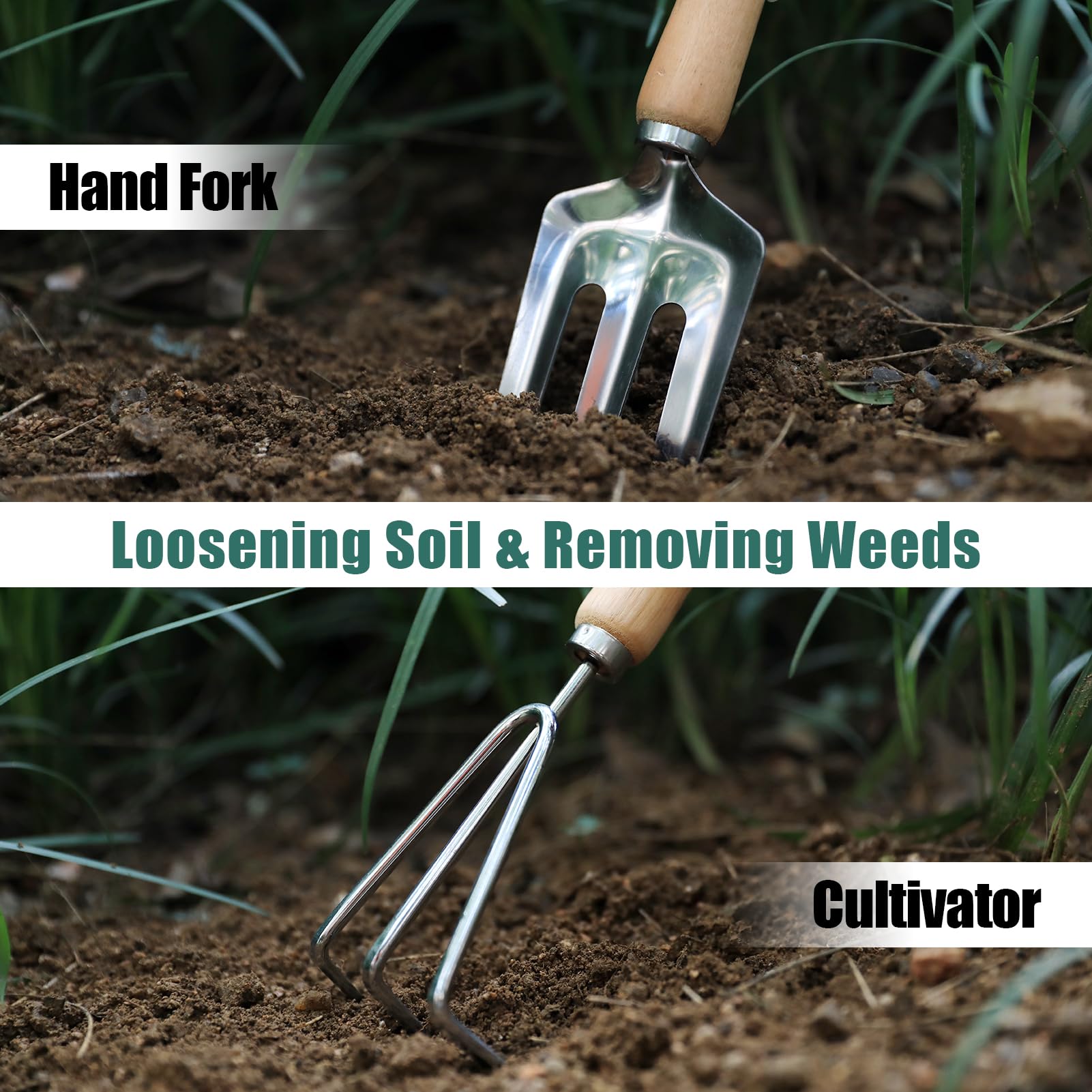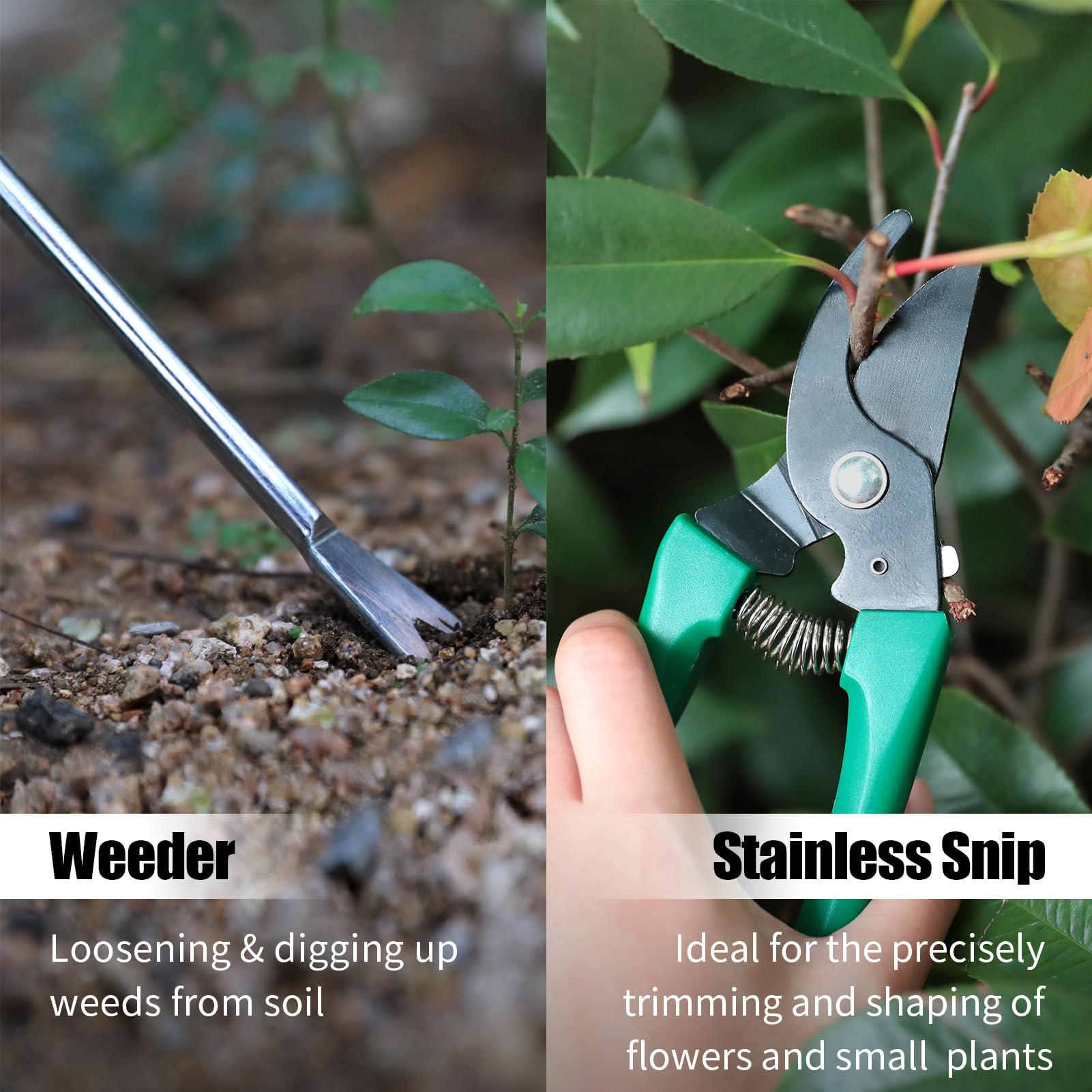- ALL IN ONE: Includes wooden handle heavy duty metal Trowel, Weeder, Transplanter, Rake, Cultivator, Pruning Shears, Garden Sprayer, Digger Claws gloves, Removable Tote Bag, Plastic Coated Binding Wire, Foldable Seat.