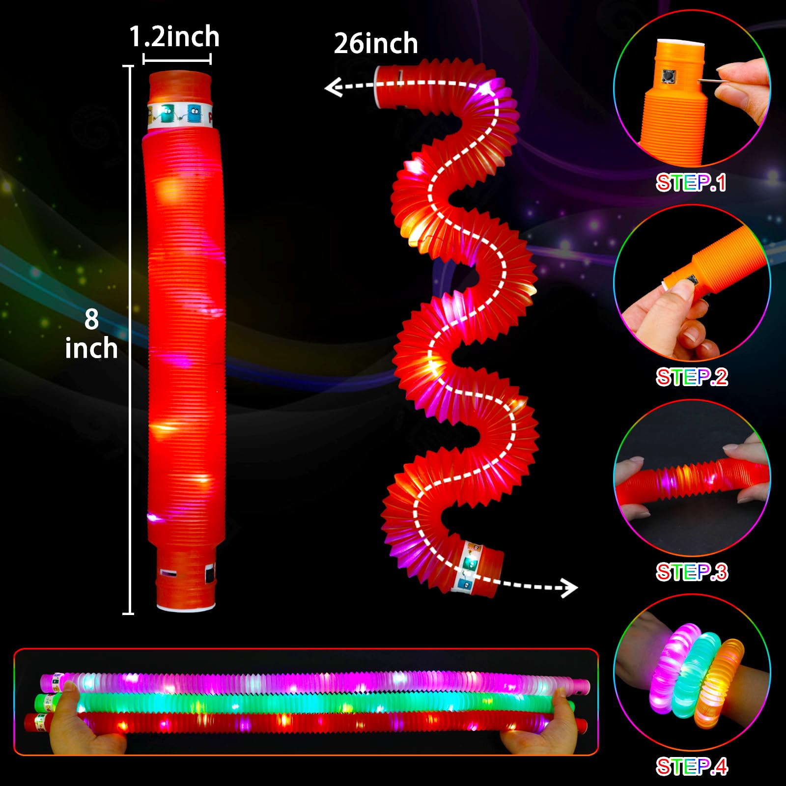 - Fidget Sensory Toys: These glow sticks make satisfying popping sounds when pulled, making it a great fidget toy for both kids and adults, enjoy playing while relieving stress. The pop tubes are sturdy and flexible enough to be used multiple times