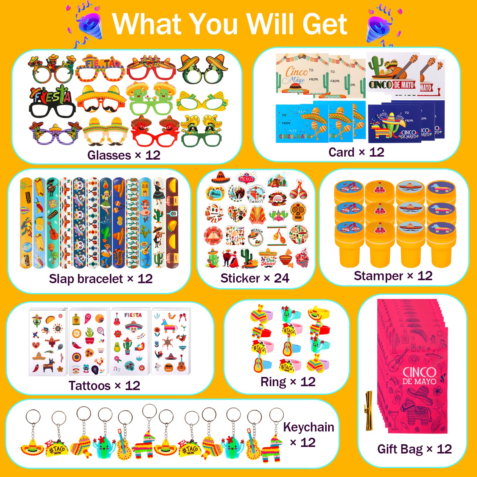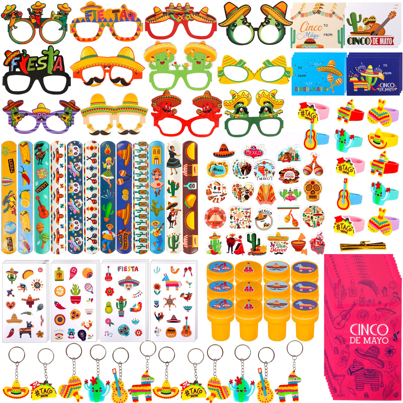 - 【Super Value Mexican Party Favor】12 Pcs fiesta slap bracelets, 12 Pcs fiesta stampers, 12 Pcs fiesta keychain, 12 Pcs fiesta rings, 24 Pcs fiesta stickers, 12 Pcs fiesta tattoos, 12 Pcs fiesta greeting cards, 12 Pcs fiesta paper glasses, 12 Pcs fiesta gift bags, Total 120 Pcs Cinco De Mayo party favors assorted different styles novelty toys. Perfect Mexican theme party celebrations for kids birthday gifts.