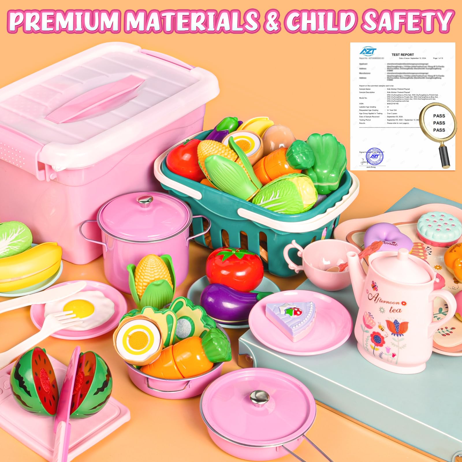 - 【PREMIUM MATERIALS & CHILD SAFETY】Our kids kitchen accessories are made from ABS material, which is sturdy, drop-resistant, and shatterproof. The non-toxic, BPA-free parts have smooth, rounded edges to protect little hands. The set also includes durable and safe stainless steel pots and pans that enhance realistic play experiences. All pieces are safety-tested and certified to ensure safe play.