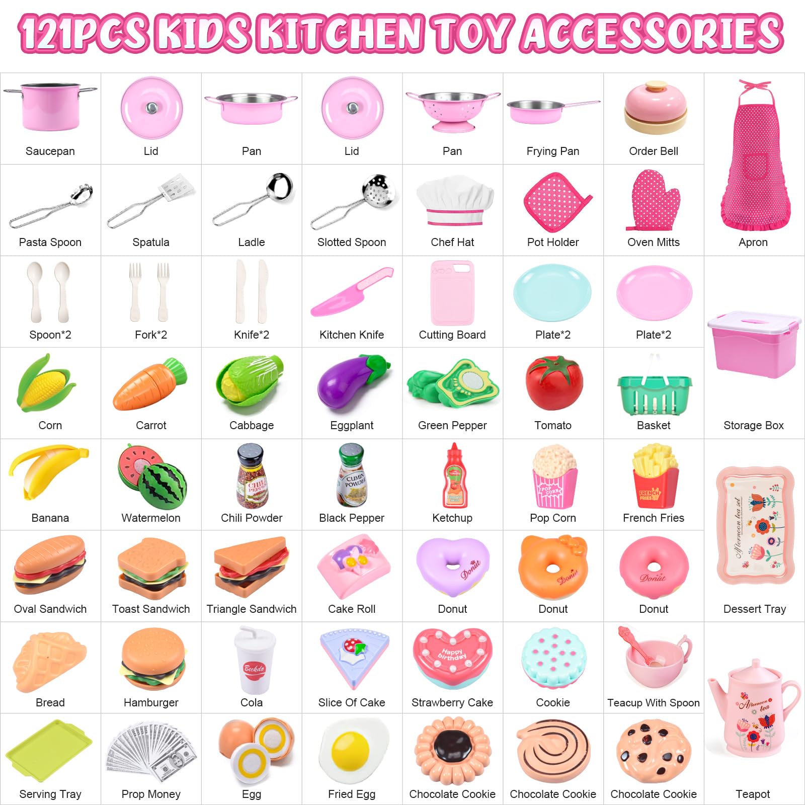 121Pcs Play Kitchen Accessories, Kids Kitchen Playset, Pretend Play Food Tea Party Set, Toy Kitchen Kids Cooking Real with Apron&Chef Hat, Utensils Cookware Pots&Pans, Toy Organizer, Toddler Toys Gift