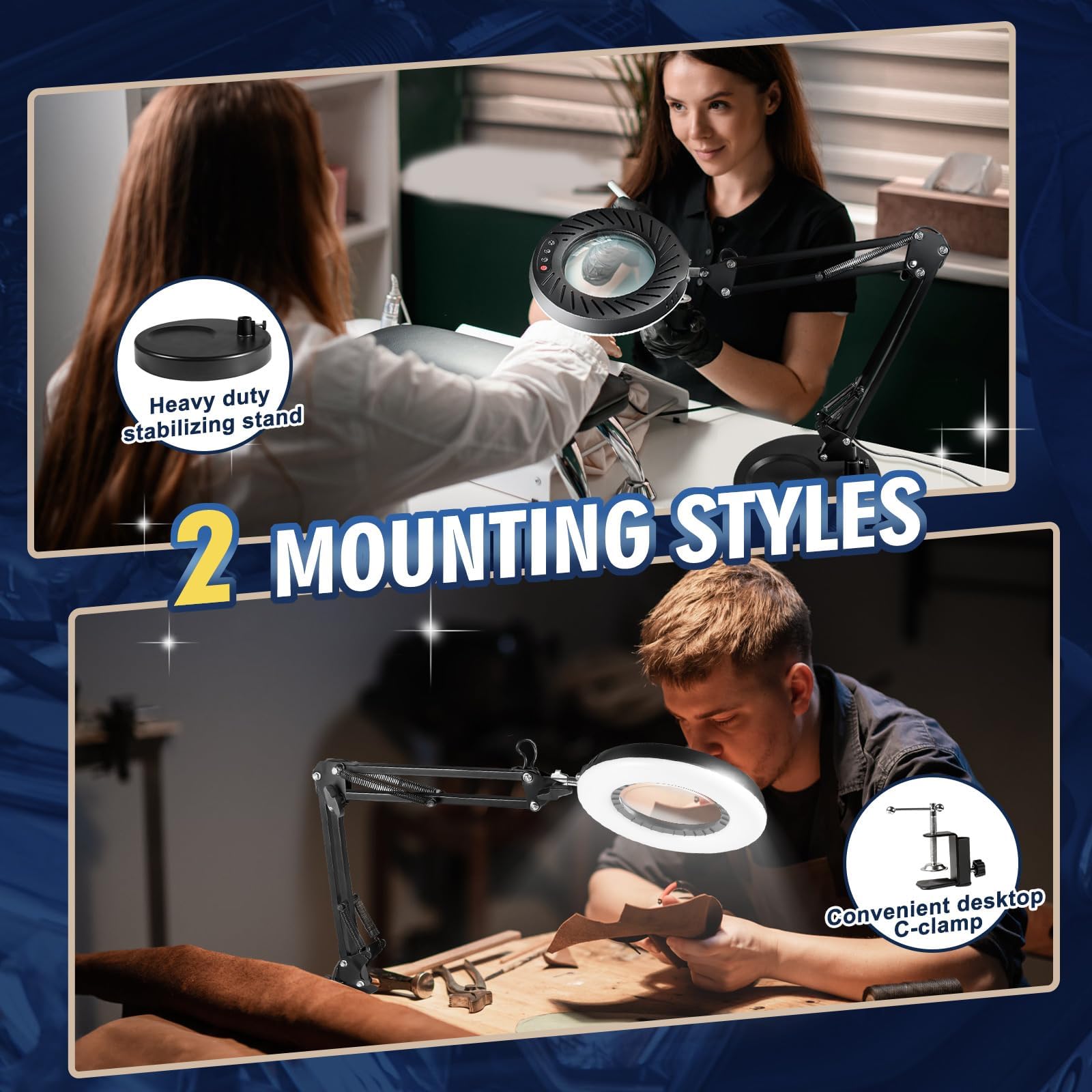 - 【Easy to Install and Use】This magnifying desk lamp features tool-free setup and USB power (works with outlets/power banks). The LED magnifying lamp with adjustable clamp is perfect for crafts, reading, and detail work. A versatile desk lamp with magnifying glass and light for any task.