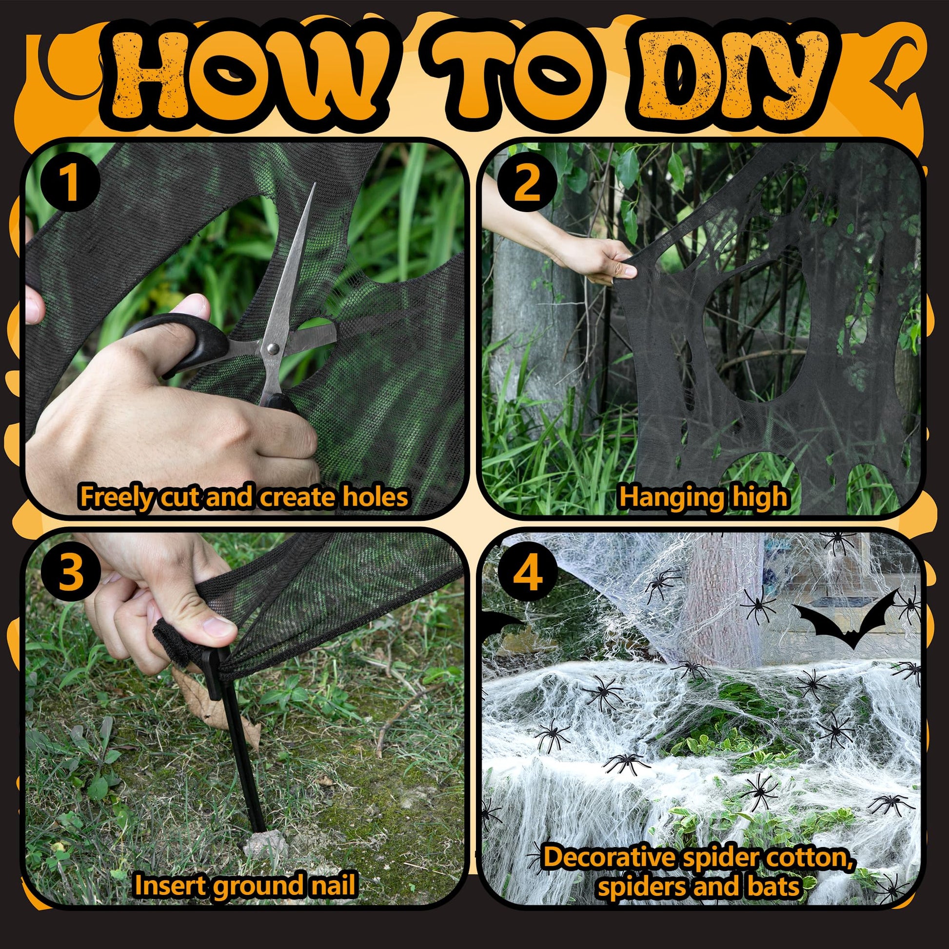 - Easy to DIY: First, fix the halloween beef netting spider web with the attached ground nails, then use scissors or a sharp object to cut enough holes of different sizes in different directions, or cut holes of any shape you want, finally stretch it to the maximum and hang it in place, you can get a giant and realistic spider web.