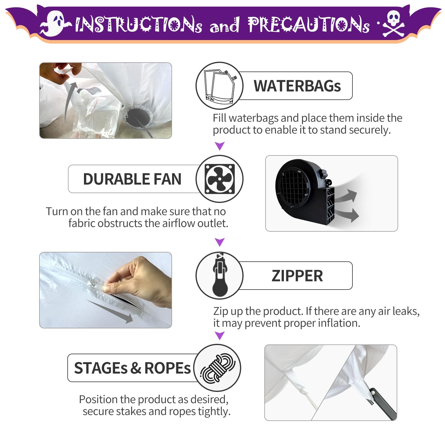 - 【Simple Setup And Storage】: Self-inflates and deflates, Just plug in this Halloween inflatable built-in fan and fix it on the ground. It will be inflated in a few seconds and everything pops up in an instant! For better stability, put in water bag and fixed rope by stakes, Don't worry about inflatable will be blown away by the wind.