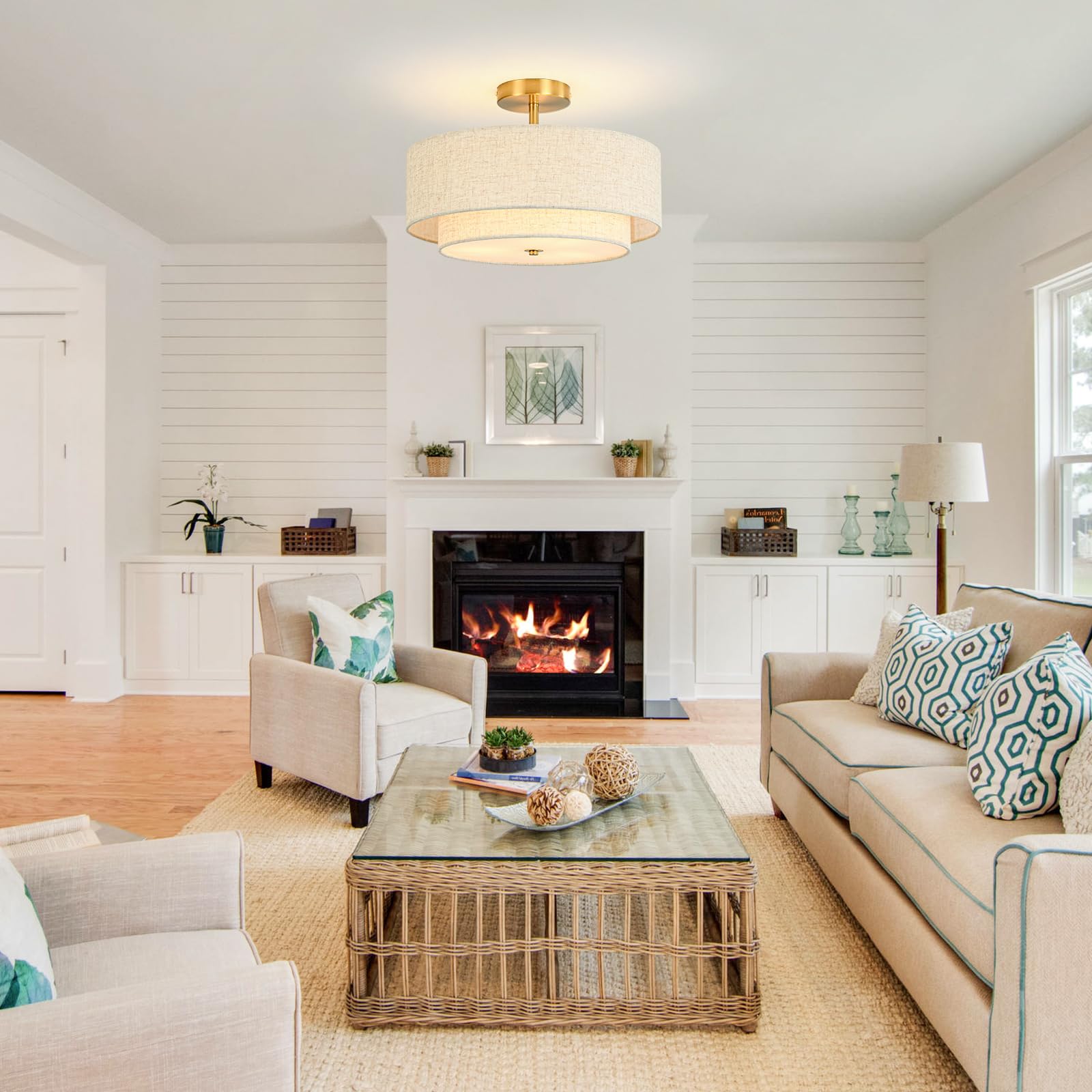 - Elegant Dual Drum Design - Adding a touch of sophistication to any room, the gold semi-flush mount ceiling light features a unique dual drum design. The combination of a soft inner shade and a linen fabric outer shade with brushed gold metal creates a timeless look that suits both modern and traditional interiors, creating a charming and warm classic atmosphere for your space.