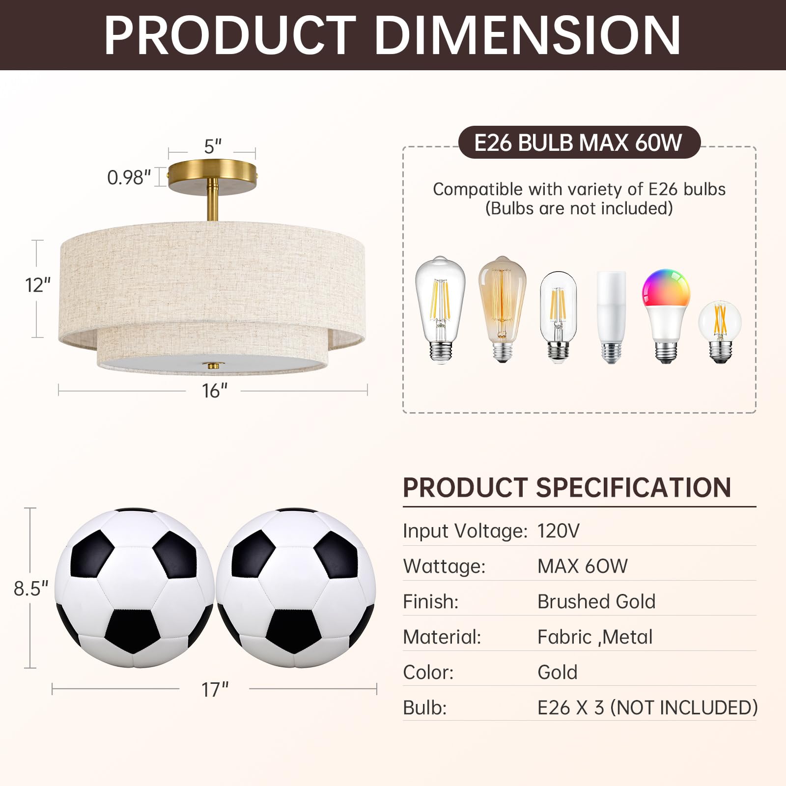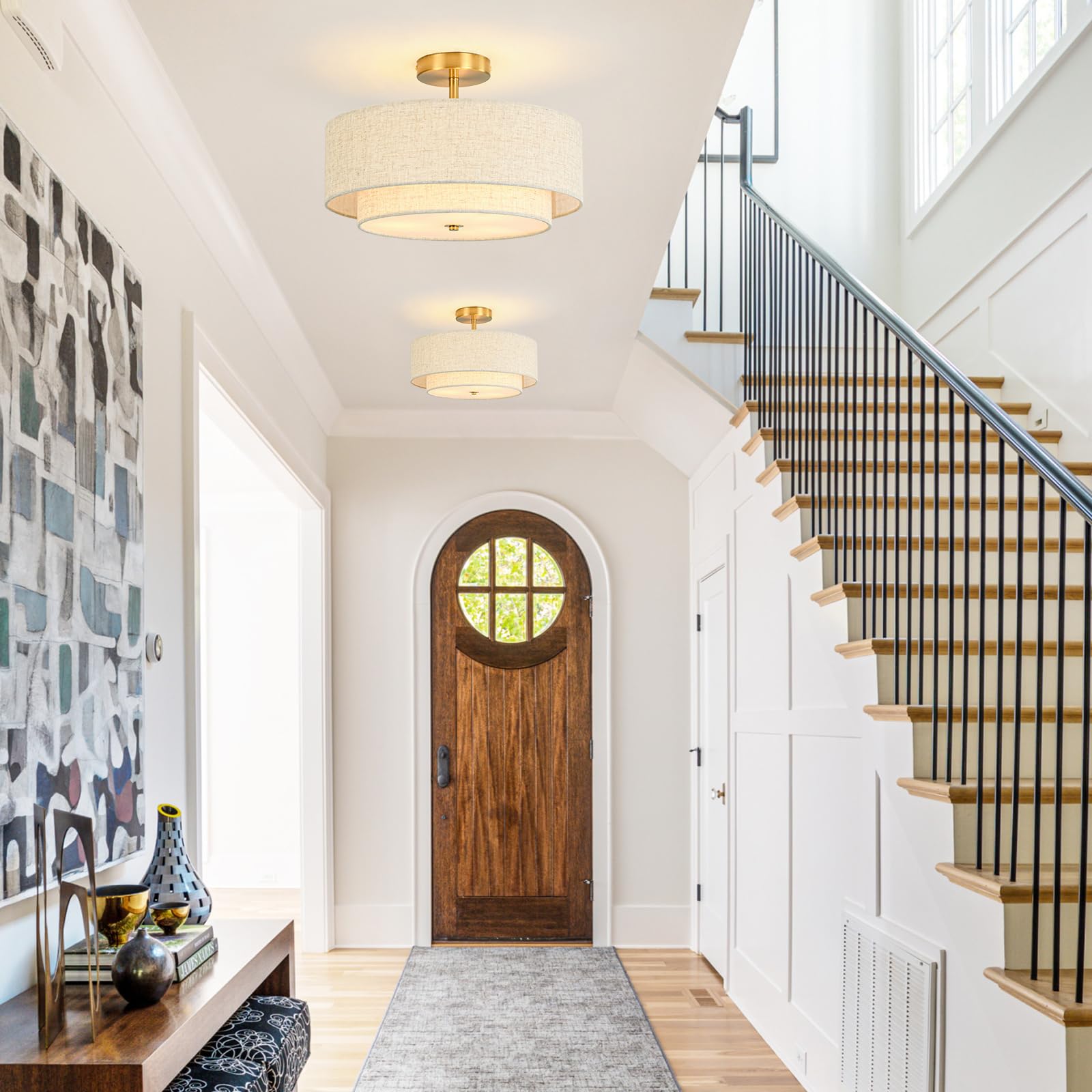 16" Semi Flush Mount Ceiling Light, 3-Light Gold Drum Ceiling Light Fixture with 2-Tier Fabric Linen Shade, Farmhouse Chandelier for Dining Room, Living Room, Bedroom, Kitchen, Hallway, Entryway
