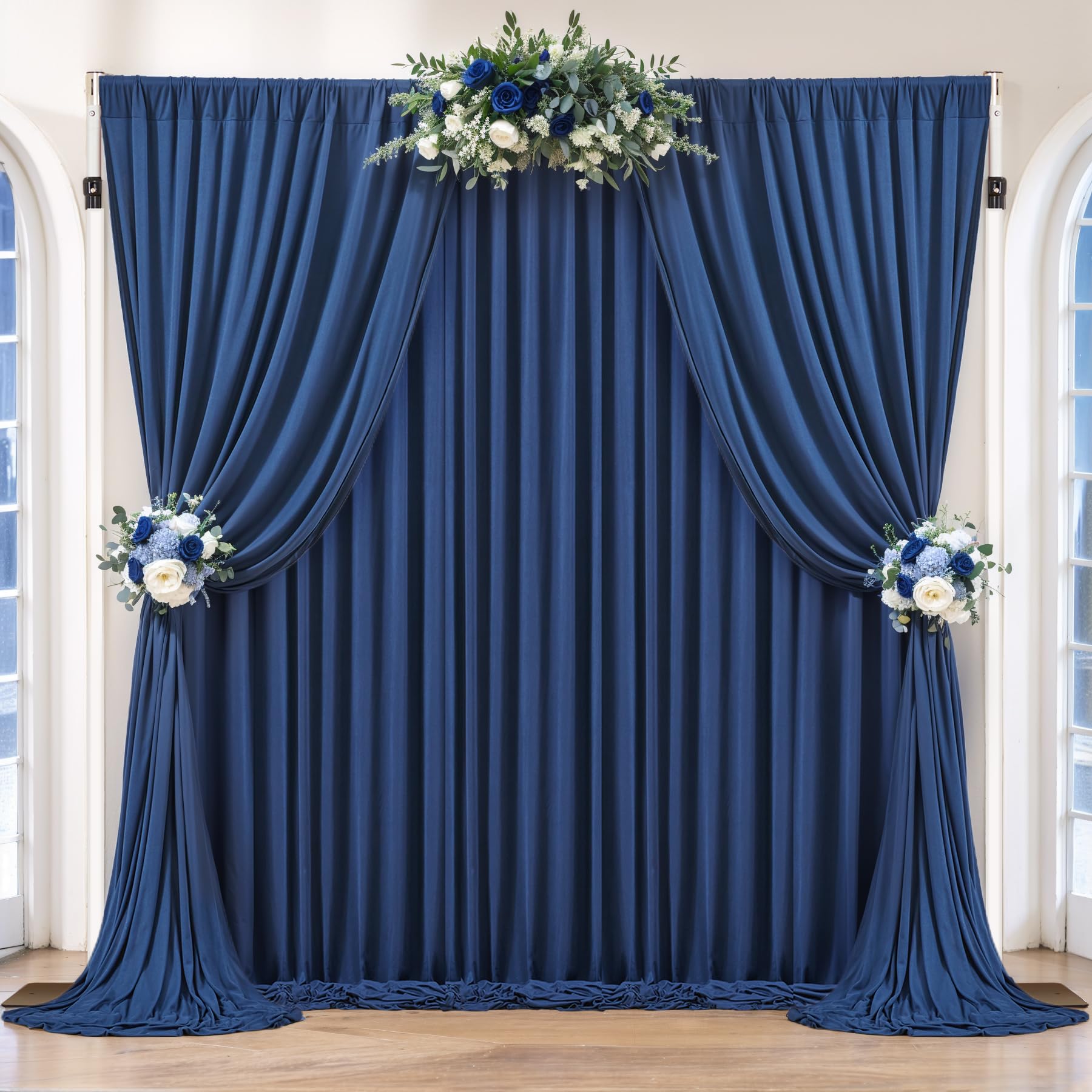 - 【Navy Blue Backdrop Curtains Packages】You will receive 4 panels navy blue wedding backdrop curtains(Each panel size: 10'L X 4'W). The 4 inch rod pocket makes a simple installation without any damage to the curtain rod. The navy blue party curtains backdrop is perfect for covering walls elegantly with flowers or ballons.