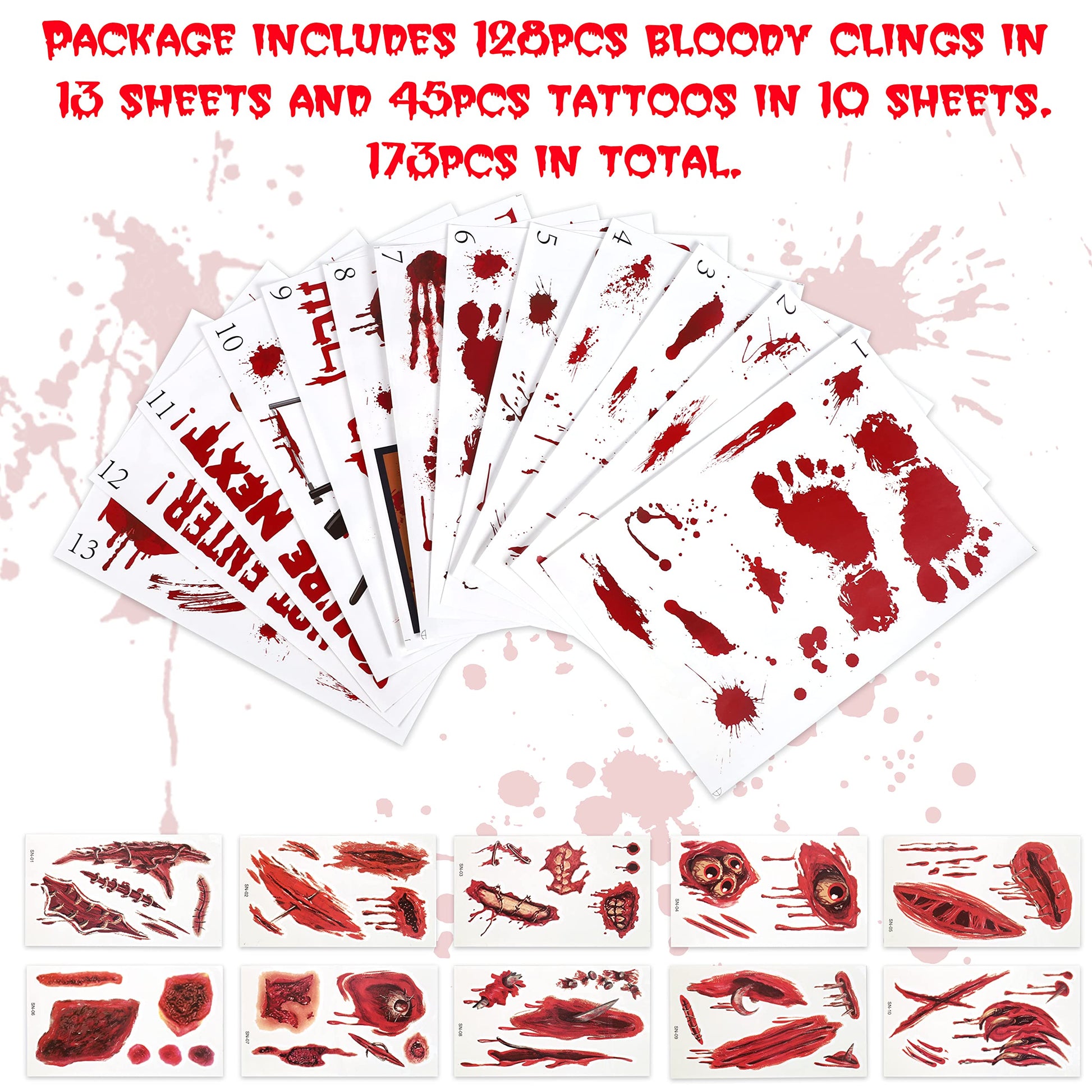- Package includes 128pcs bloody clings in 13 sheets and 45pcs tattoos in 10 sheets. 173pcs in total.Features footprints,shoes prints,zombie hands,restroom sign,handprints,bloodstains,scissors,saw,wrench,”YOU’RE NEXT!”,”DO NOT ENTER”,etc