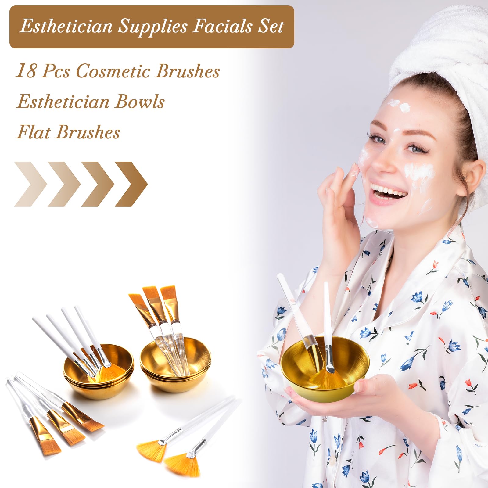 18 Pcs Esthetician Supplies for Facials Set 6 Gold Facial Bowls Esthetician 6 Facial Brushes Esthetician 6 Flat Brushes Face Mask Cosmetic Applicators for Women Facial Mask Mixing Kit Facial Tools