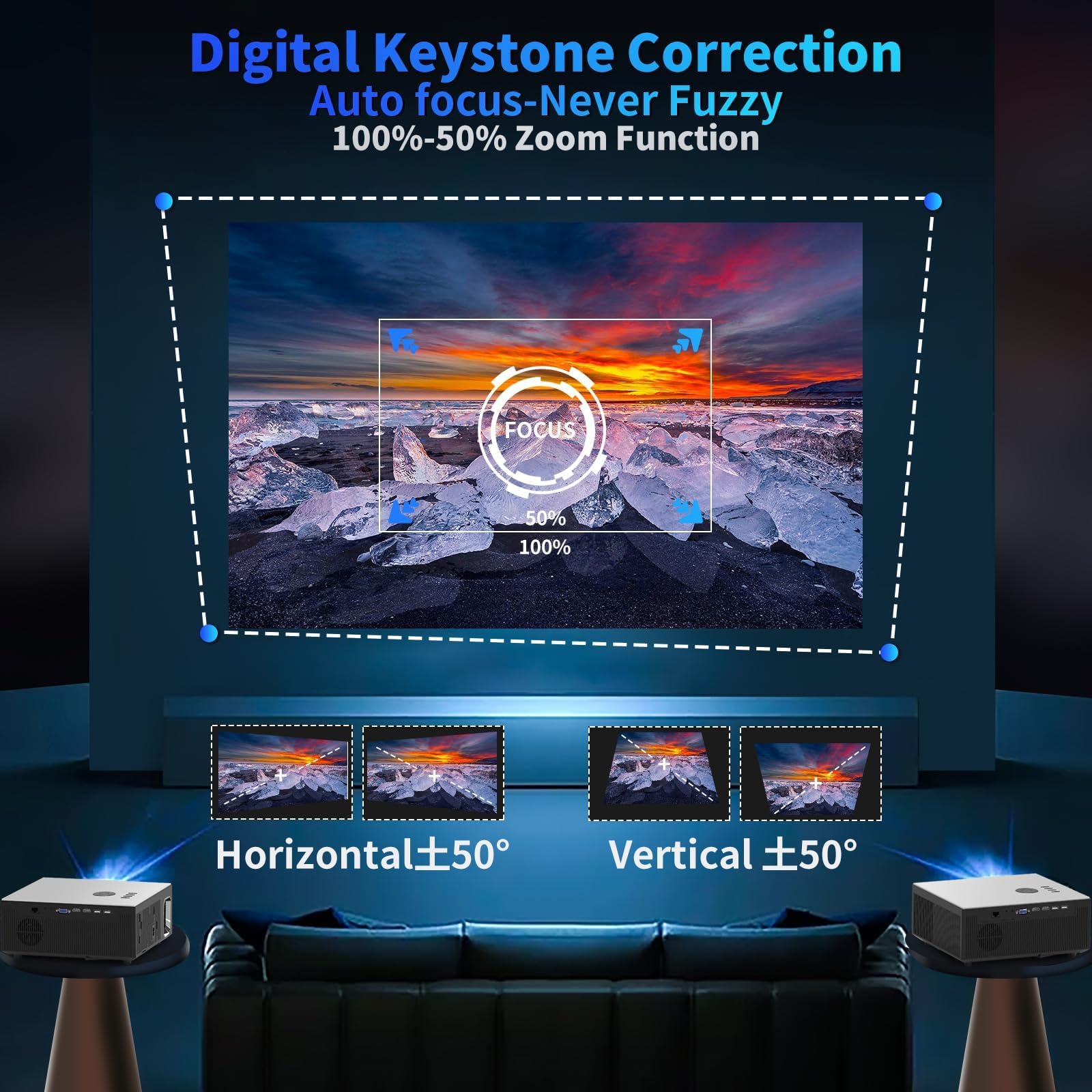 - 【Innovative Auto Focus and Keystone Correction & Image zoom 50% & 500" Big Display】4K Projector Adopts auto-focus and 6D keystone technology, you can get a perfect clear rectangular picture and sharp visuals in 5 seconds after starting up! With the ZOOM function, it can adjust image size from 50% to 100% display using the remote without moving the projector.Viewing the best experience with a wide range of 60-500 inches wherever you are