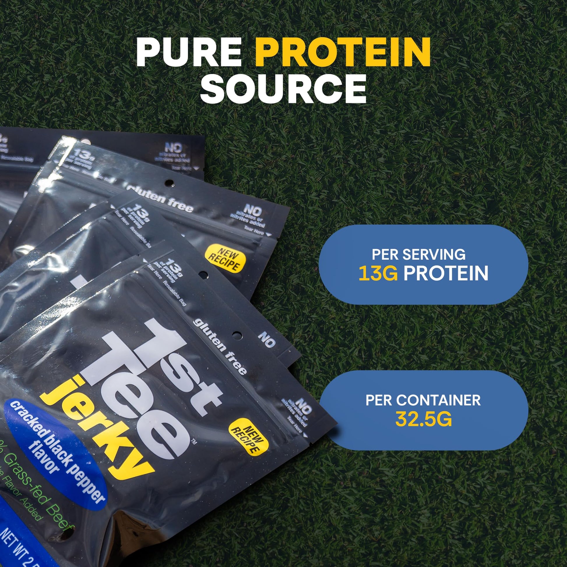 1st Tee Cracked Black Pepper Beef Jerky made with grass-fed beef jerky, 13 grams proteins and one gram fat per serving 2.5oz
