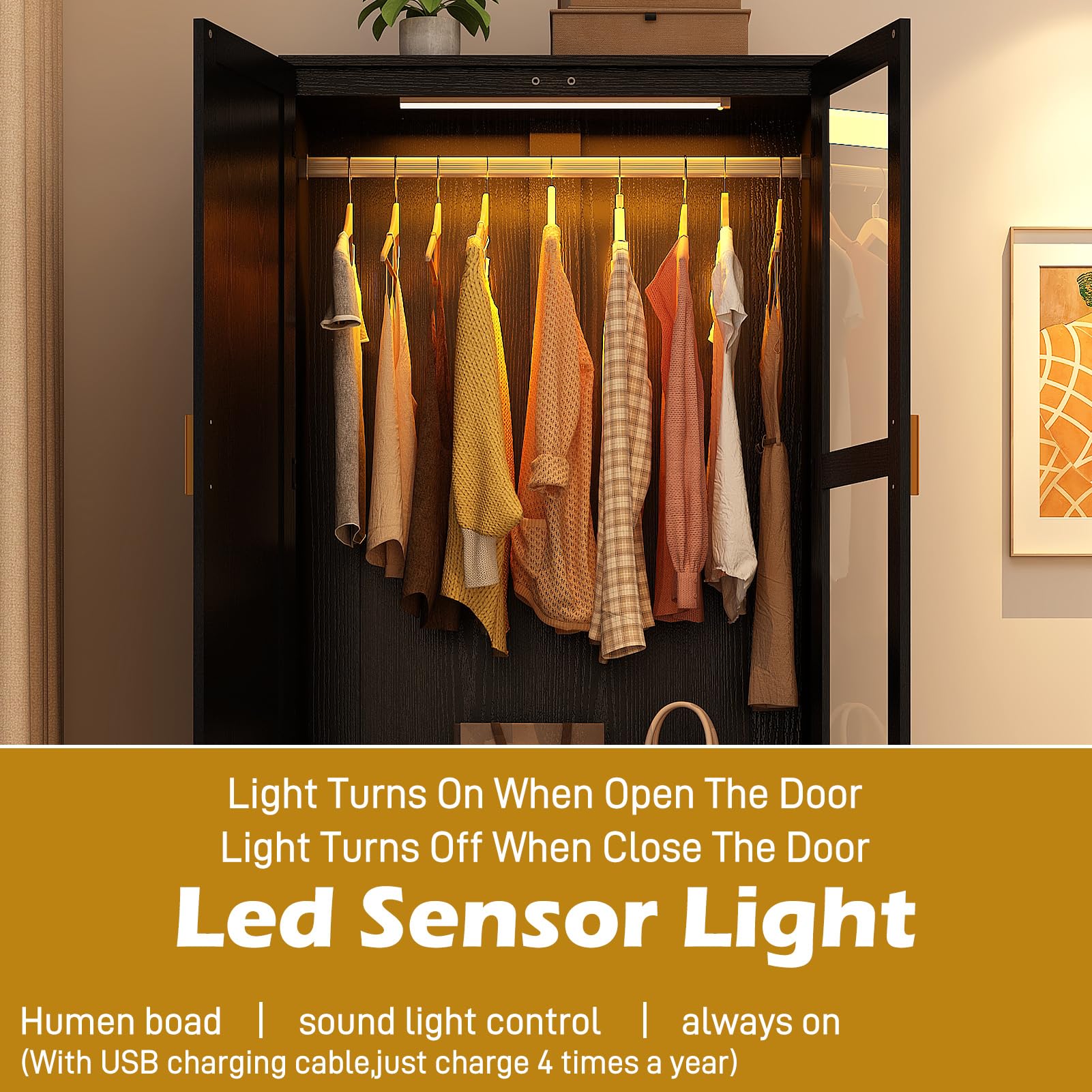 - Armoire Wardrobe Closet with LED:this 71" freestanding wooden wardrobe closet cabinet for bedroom Equipped with human body intelligent induction light, the door light turns on when opened and turns off when it is closed the door. The induction range is within 5 meters, so you can easily find clothes at night.The LED light is charged via the included USB charging cable and can be used for 3-5 months on a single charge.
