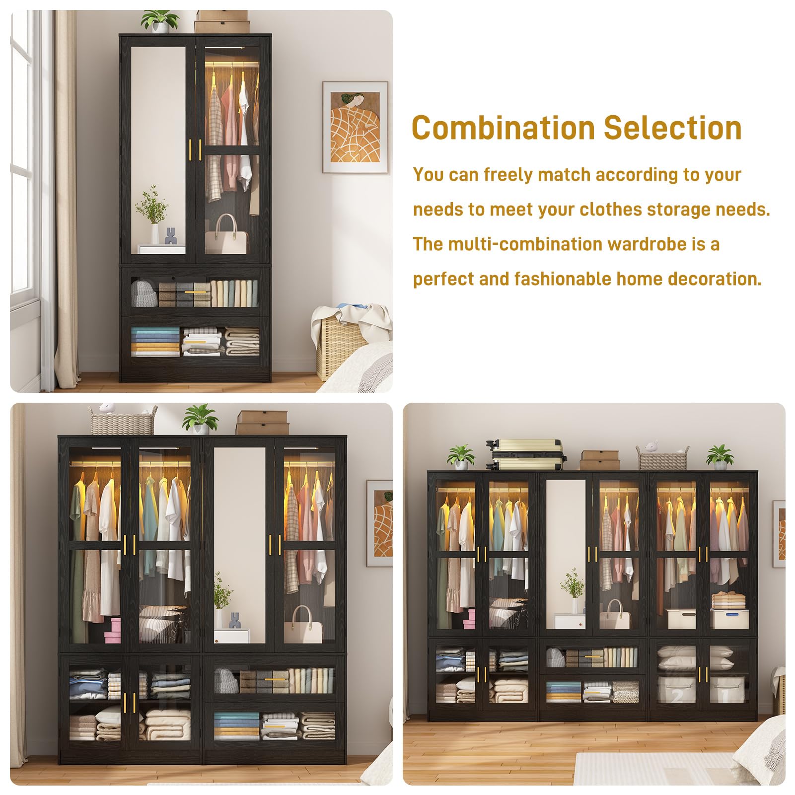 - Visual High-Definition Tempered Glass Door Board Structure:Adopting high-transmittance tempered glass door board structure, transparent design, clear vision, convenient to check and find the clothes and items stored inside,It saves you the hassle of searching for clothes in your closet. Plus the built-in LED light effect, let your wardrobe's internal storage system become part of the space display art.