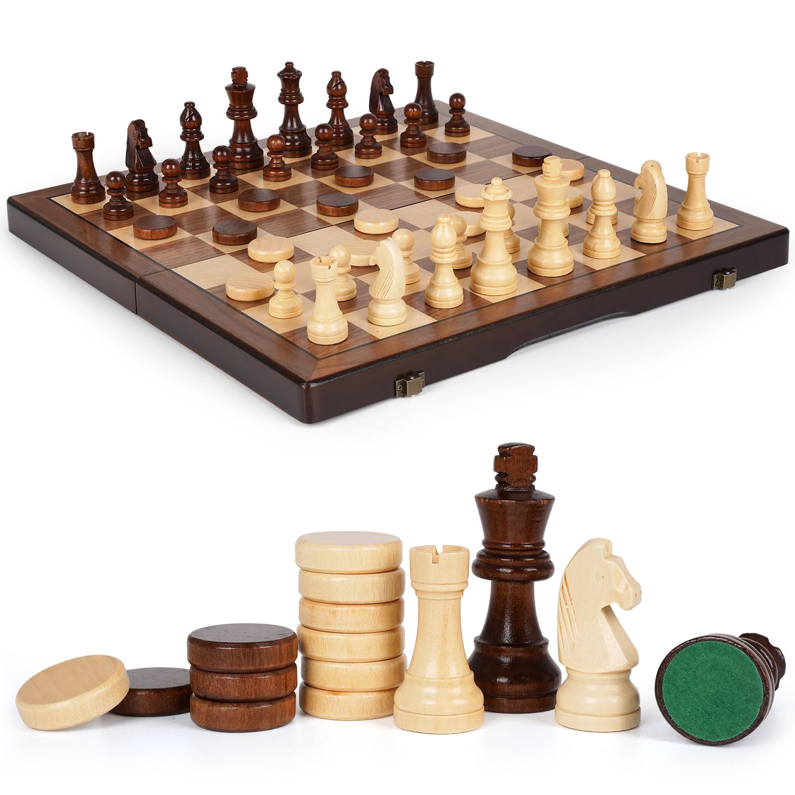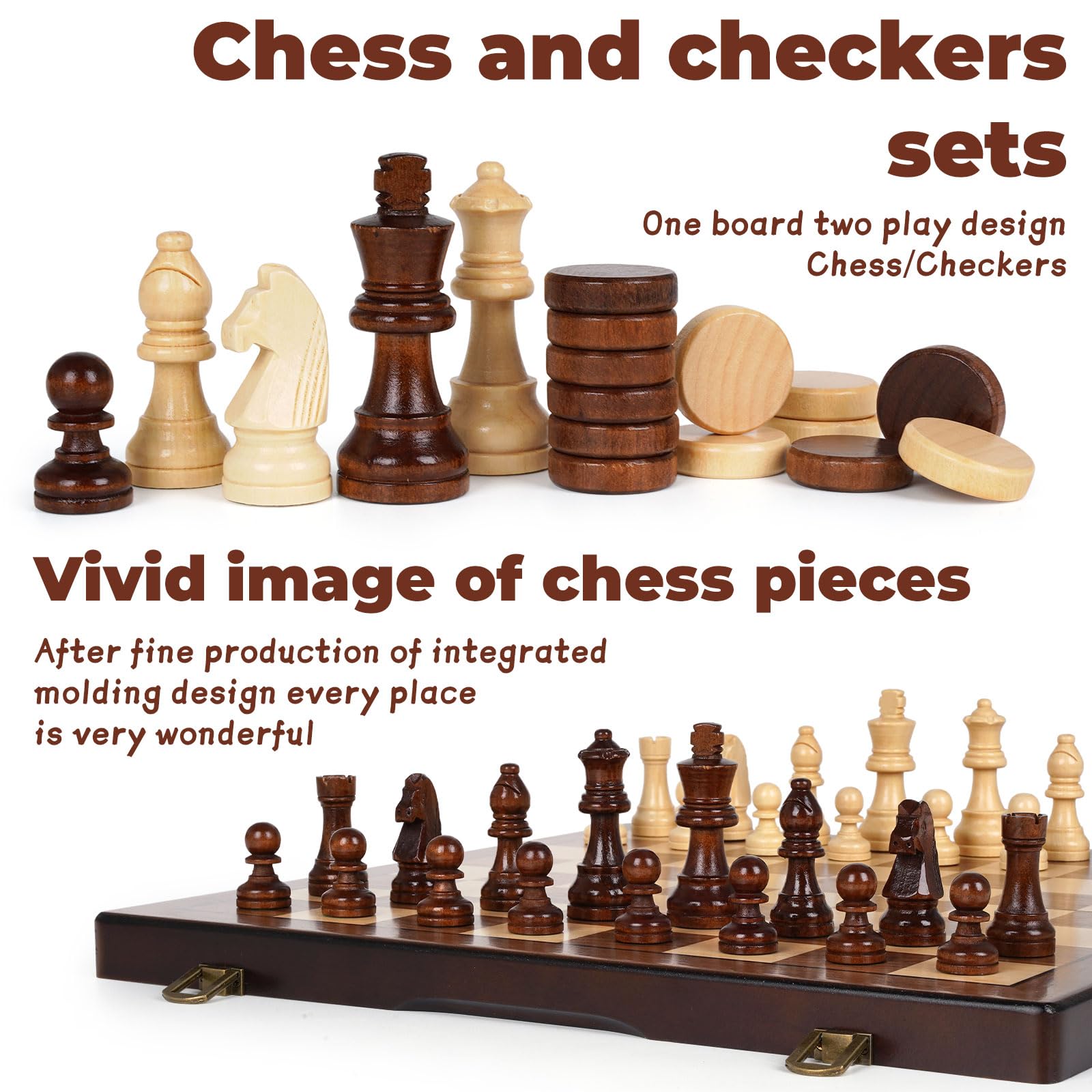 - EXQUISITE CHESS PIECES – Each piece of this Staunton chess and checker set is crafted of high-quality solid wood by experienced artists for perfect and flawless details and the best touch. This set contains 24 checkers and complete pieces including 2 extra queens. The king is 3 inch in height for a better grip for people who loves large chess pieces