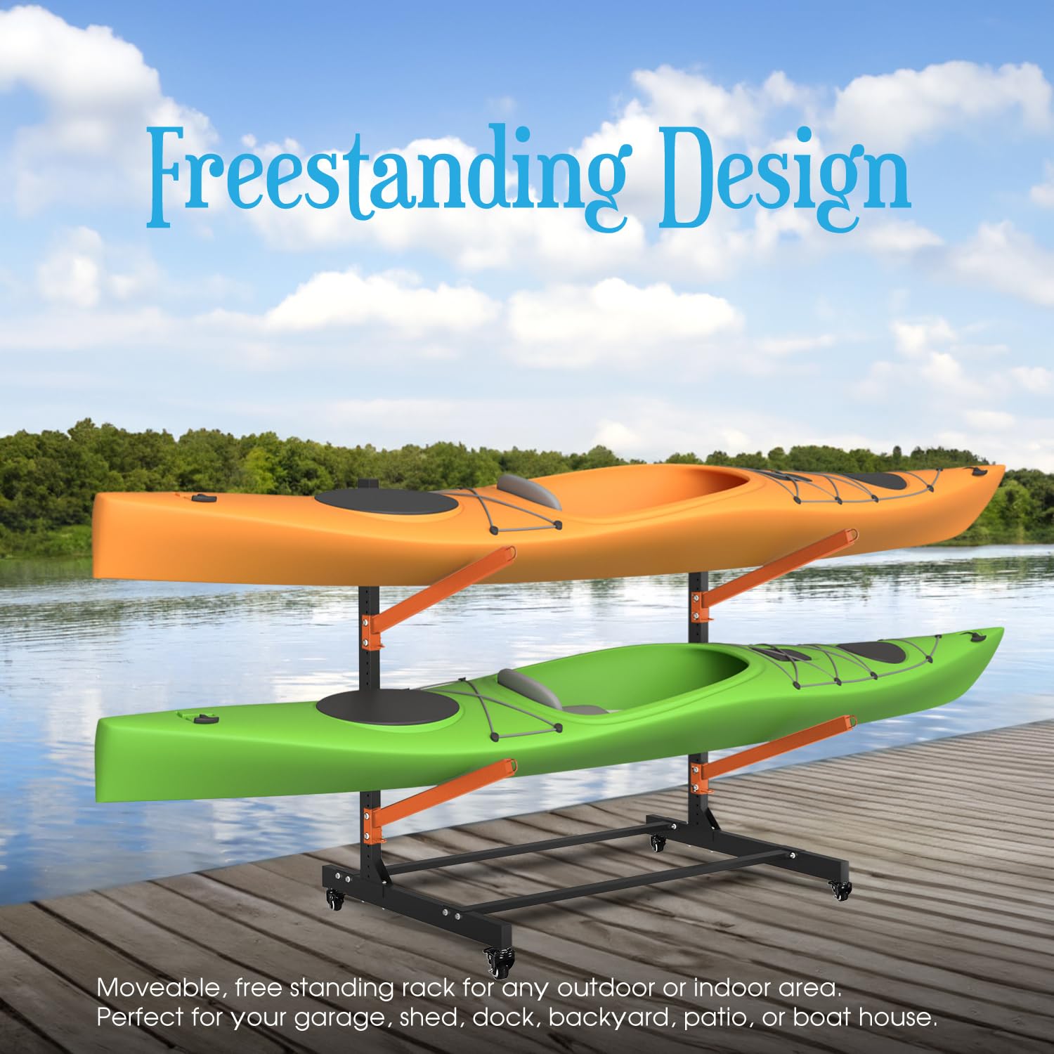 - ADJUSTABLE SIZE FOR VERSATILE SIZE: The kayak storage rack features adjustable size bars, allowing you to customize the width of the holding bar to fit a variety of water sports watercraft. The freestanding design makes the kayak rack portable, suitable for any indoor and outdoor space, and is perfect for your dock, backyard, porch or boathouse.