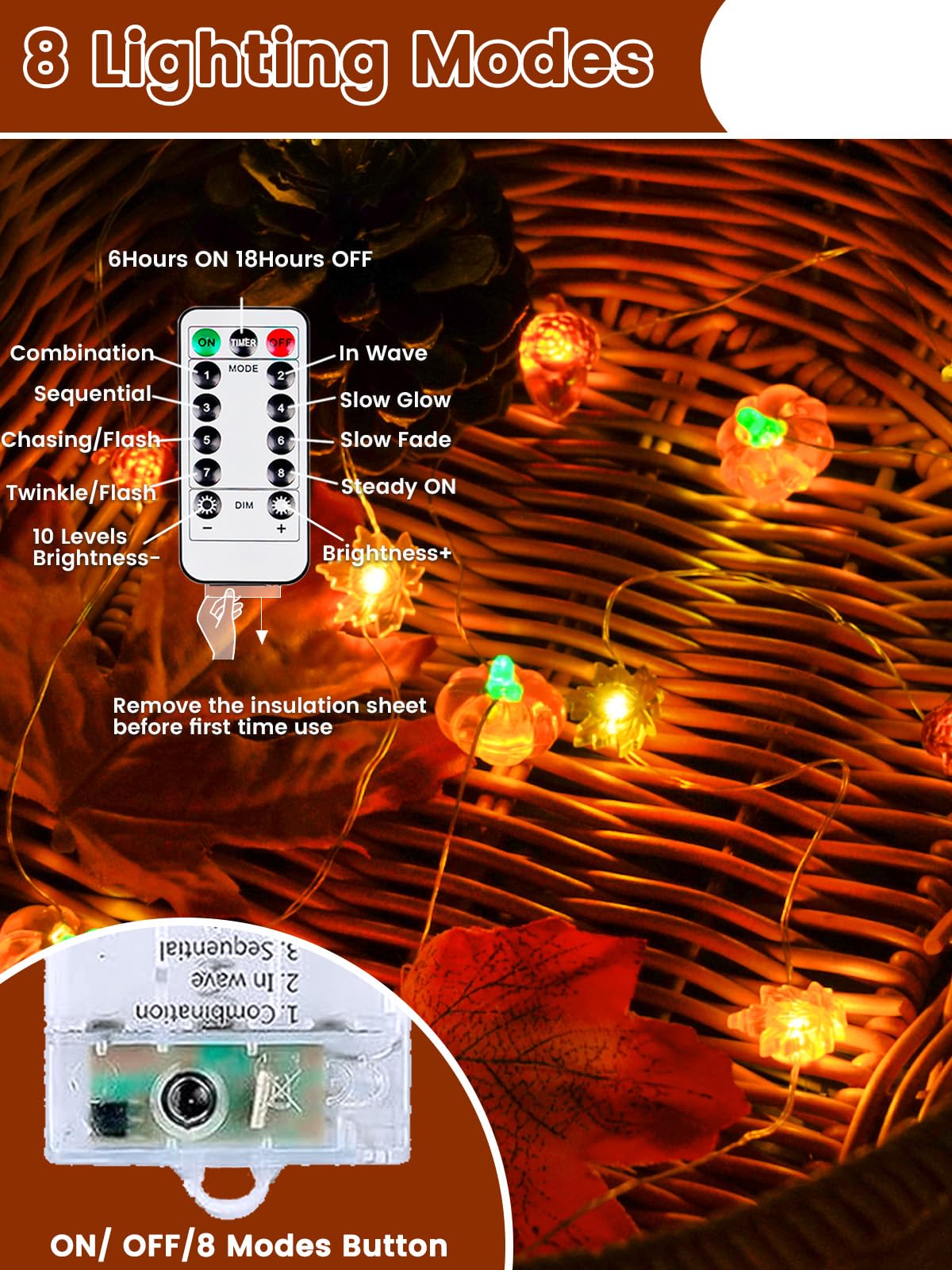 - Remote Control& 8 Modes& Timer Function: These Thanksgiving lights offer 8 modes, switched on the battery box or by remote. Using the remote control you can also set the brightness level (10 levels) as well as set the auto-timing(6/18 hrs).These string lights can rememer the setting you chose the night before.