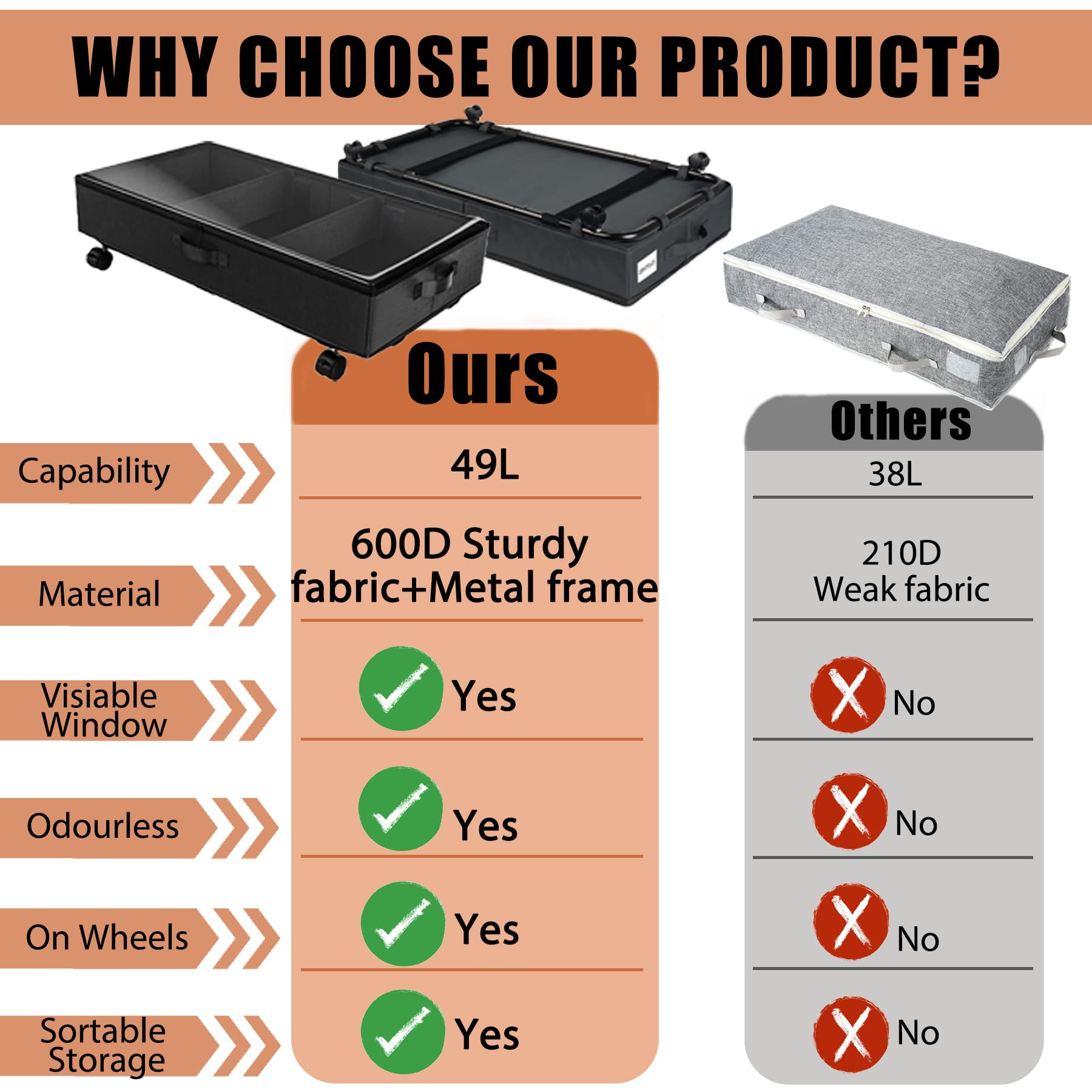 - 【600D Oxford Fabric+ Sturdy Metal Frame】Under the bed storage is made of high quality 600D Oxford fabric, sturdy metal frame and 4.3mm plastic board, compared with other fragile metal mesh and easy to tear non-woven material, our underbed storage bins is more sturdy and durable, with stronger load bearing capacity (up to 66lbs) and won't be deformed, and it's also dustproof and moisture-proof, which will meet your long term storage needs.