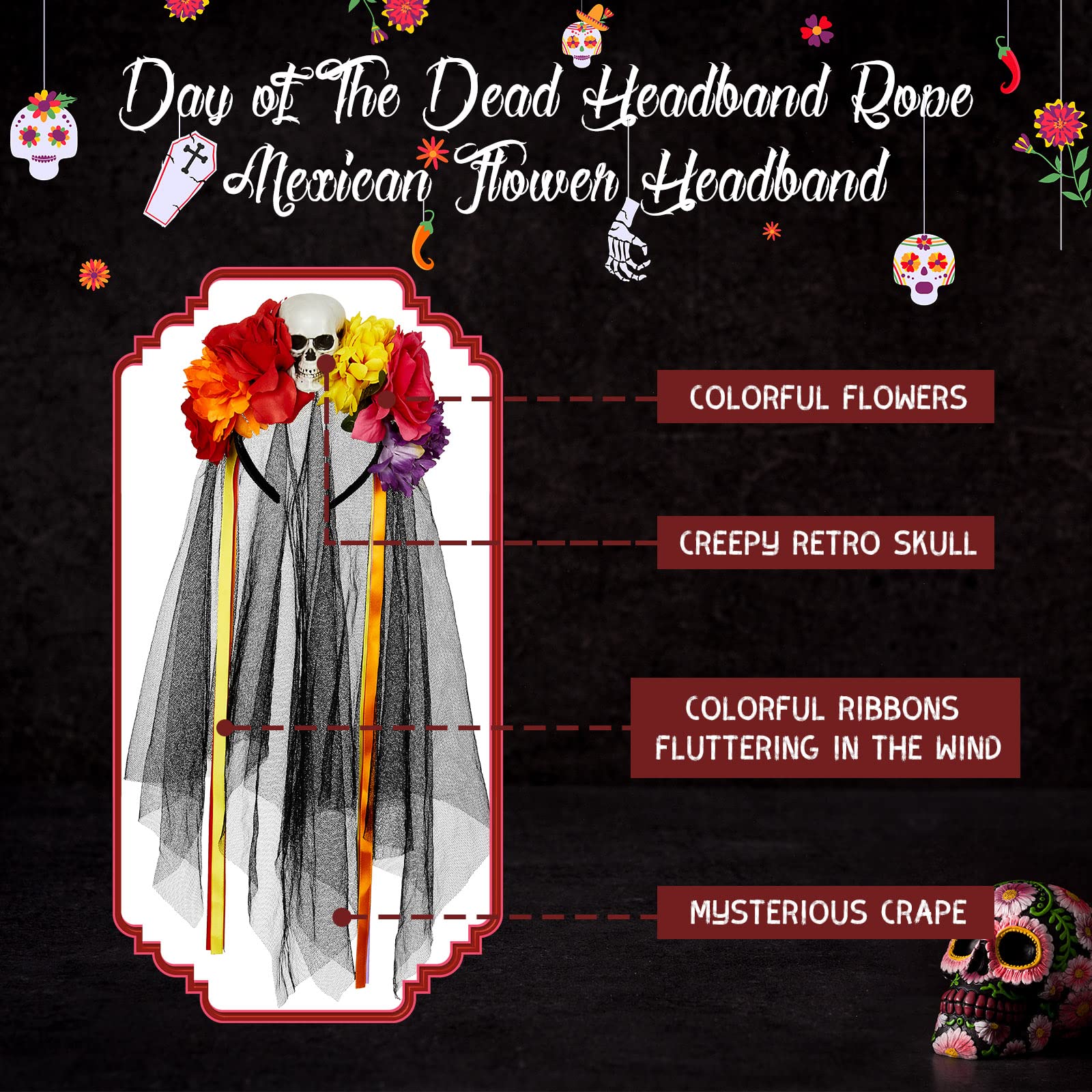 - Attractive Headband: the Day Of The Dead flower headband combines beautiful flowers and a scary skull, and is designed with black veil with colored ribbons on both sizes, which can create an atmosphere of mystery and terror