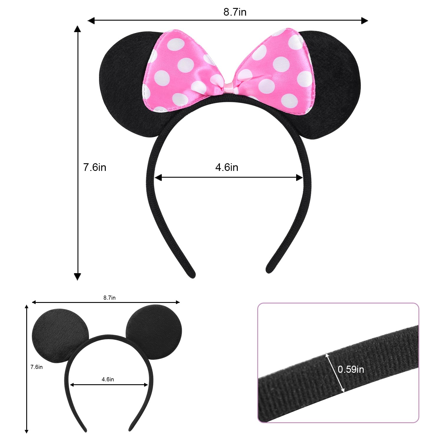 - MATERIAL:Made of soft, felt-like fabric while the ears have a cute pink dotted bow. With the size of 8.7 x 7.1 x 0.6 inches, this mouse ears headband fits for adults' head as well as toddlers