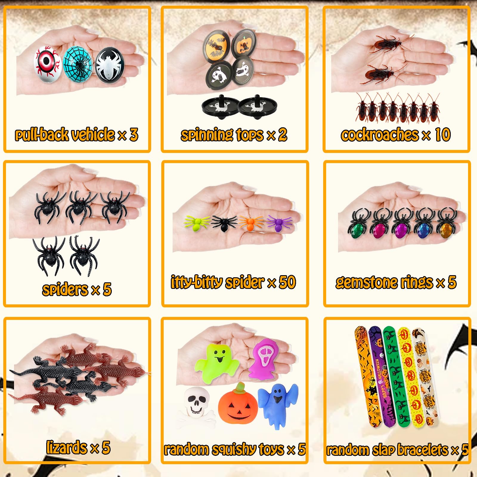 - đ»ăWhat's includedă 200 PCS Halloween Party Favors Set: This set includes 200 toys in 23 different styles, all featuring fun Halloween-themed designs. For specific quantities of each item, please refer to the pictures and What's in the box part.You will get tattoo stickers, spider, silkworms, cockroach, bats, centipede, snake, lizard, braces, marble discs, skullïŒboomerang spider, pumpkin mochi squishy, kaleidoscope, spectacles, pumpkin man and so on !