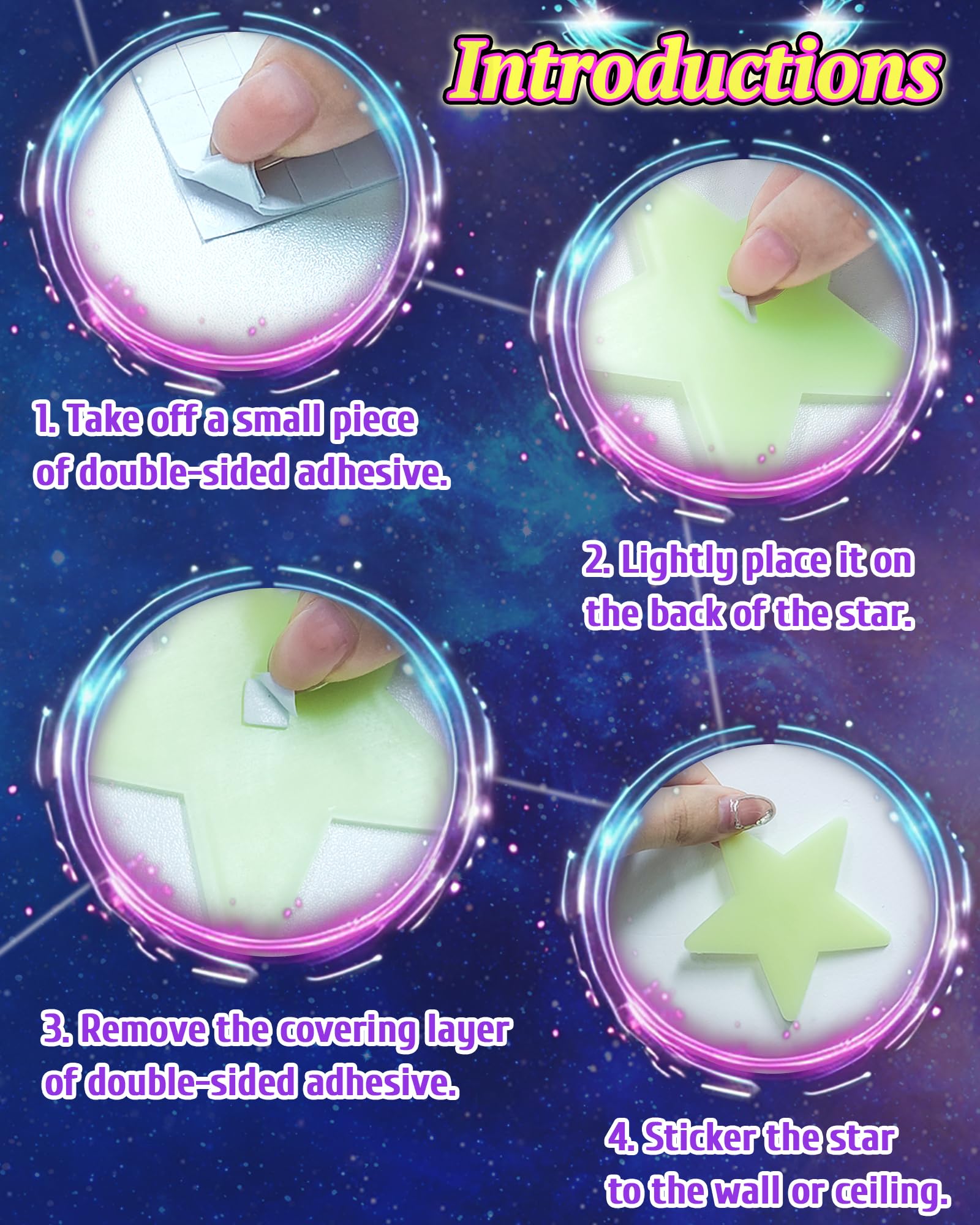 - Glow in the Dark Tips: Make sure the glowing stars get 15-30 minutes light for before use. The stars look dim when near window or room is light, because they require darkness. Customer satisfaction is our greatest motivation, we produce these glow in the dark stickers to the highest quality standards, and to nurture minds and hearts.