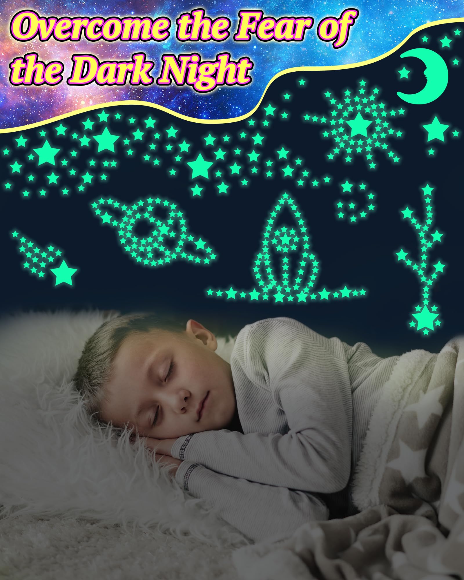 - Glow In The Dark Stars: Each pack includs 200 pcs glow in the dark stars and a bonus moon. The glowing stars would make the room looks like the night sky when the room is dark. It's a good solution to help those kids who fear of the dark, making it perfect for bedtime.