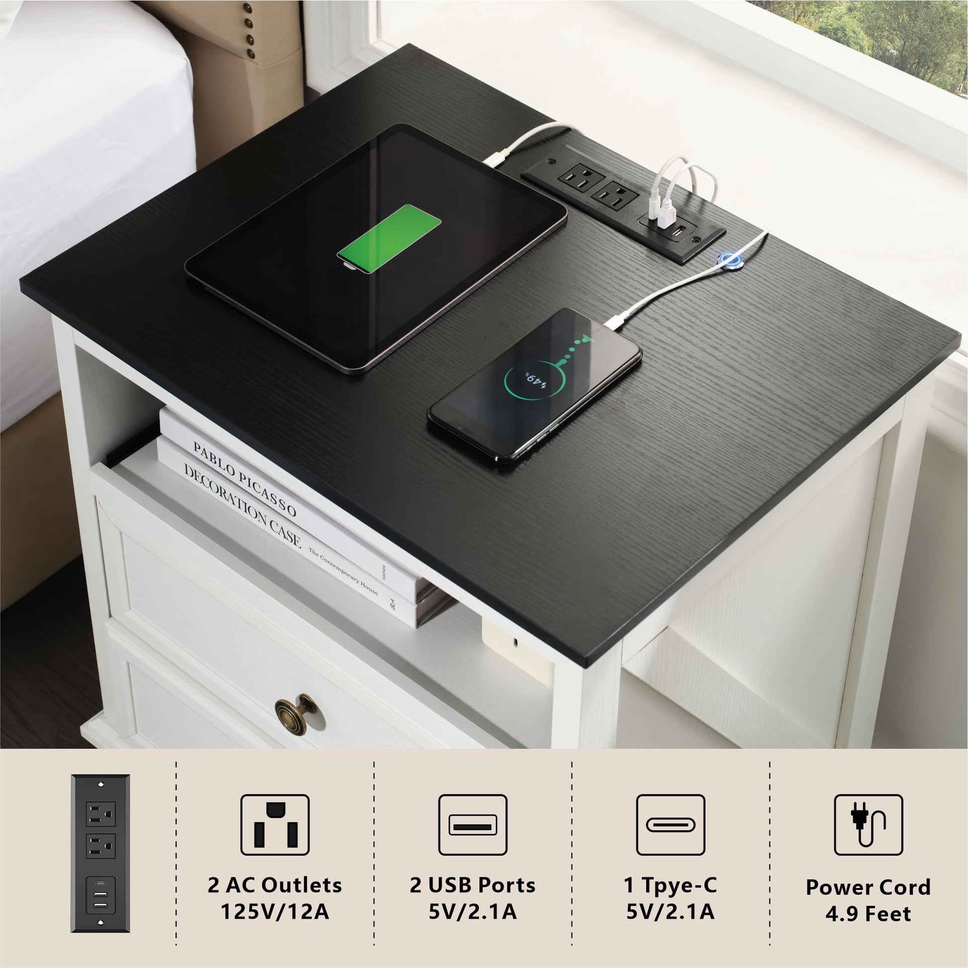 - Convenient Charging Station Stay connected with this nightstand’s built-in charging station, including 2 AC outlets, 2 USB ports, and 1 Type-C port. Ideal for modern bedrooms, this nightstand with a charger station keeps your devices powered while maintaining a sleek, stylish aesthetic
