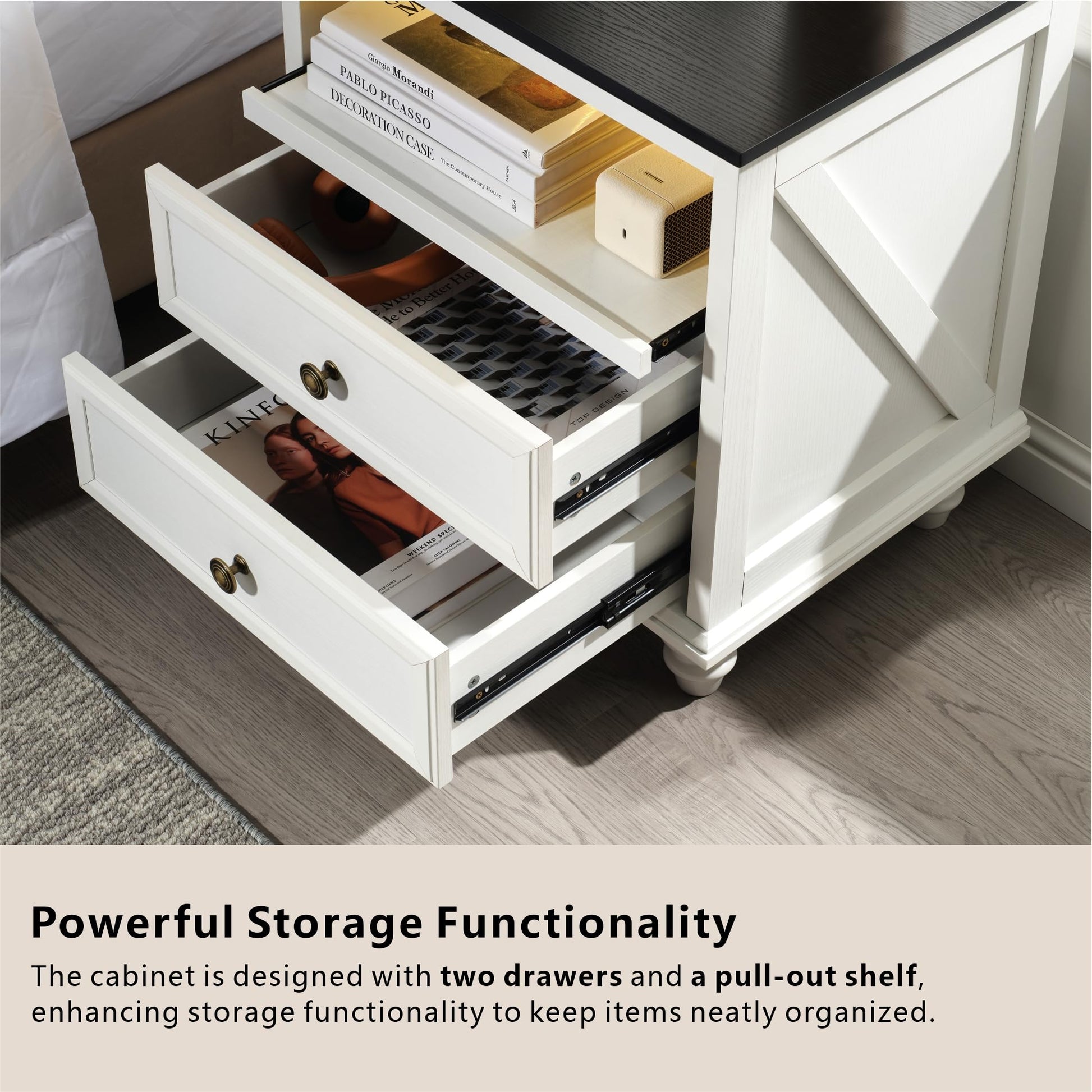 - Pull-Out Tray for Extra Space Maximize functionality with the pull-out tray, expanding the desktop area for temporary workspace or additional storage. Perfect for holding a laptop, iPad, or other essentials, this nightstand with drawers offers versatile convenience