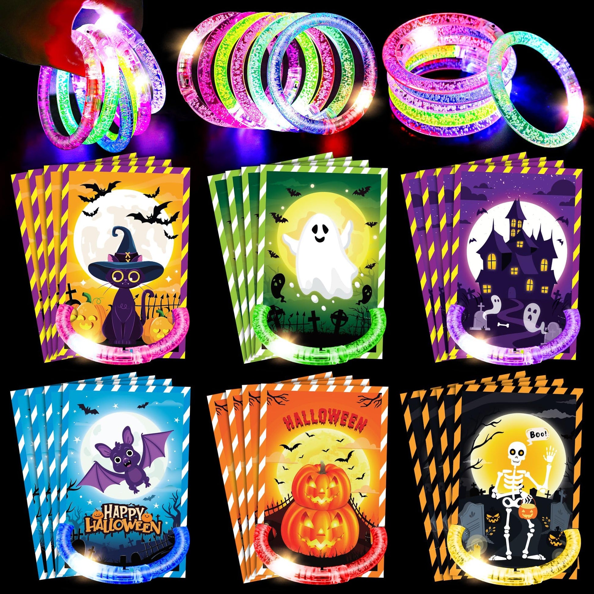 - 【Halloween Party Favors】You will get 24pcs glow stick bracelets and 24pcs cards. The glow bracelets are designed in 6 neon colors (purple, pink, white, yellow, green, blue). There are 6 different styles of cards, and each card features a Halloween themed pattern, like pumpkin, ghost, skull, bat, witch, castle and so on. Scary but funny, full of the charm of Halloween