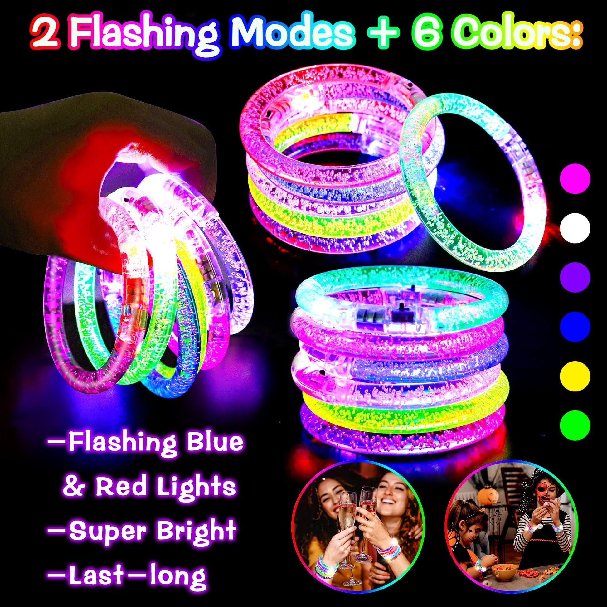 - 【Halloween Light Up Party Supplies】Attractive Halloween designs and endless fun. Share it with friends, family, classmates and colleagues, and send your best wishes for Halloween. Easy On/Off Switch For Re-use. The light up bracelet will flash red and blue lights alternately, making it look brighter and more dazzling at the party. Approximately 10-14 Hrs of glow time