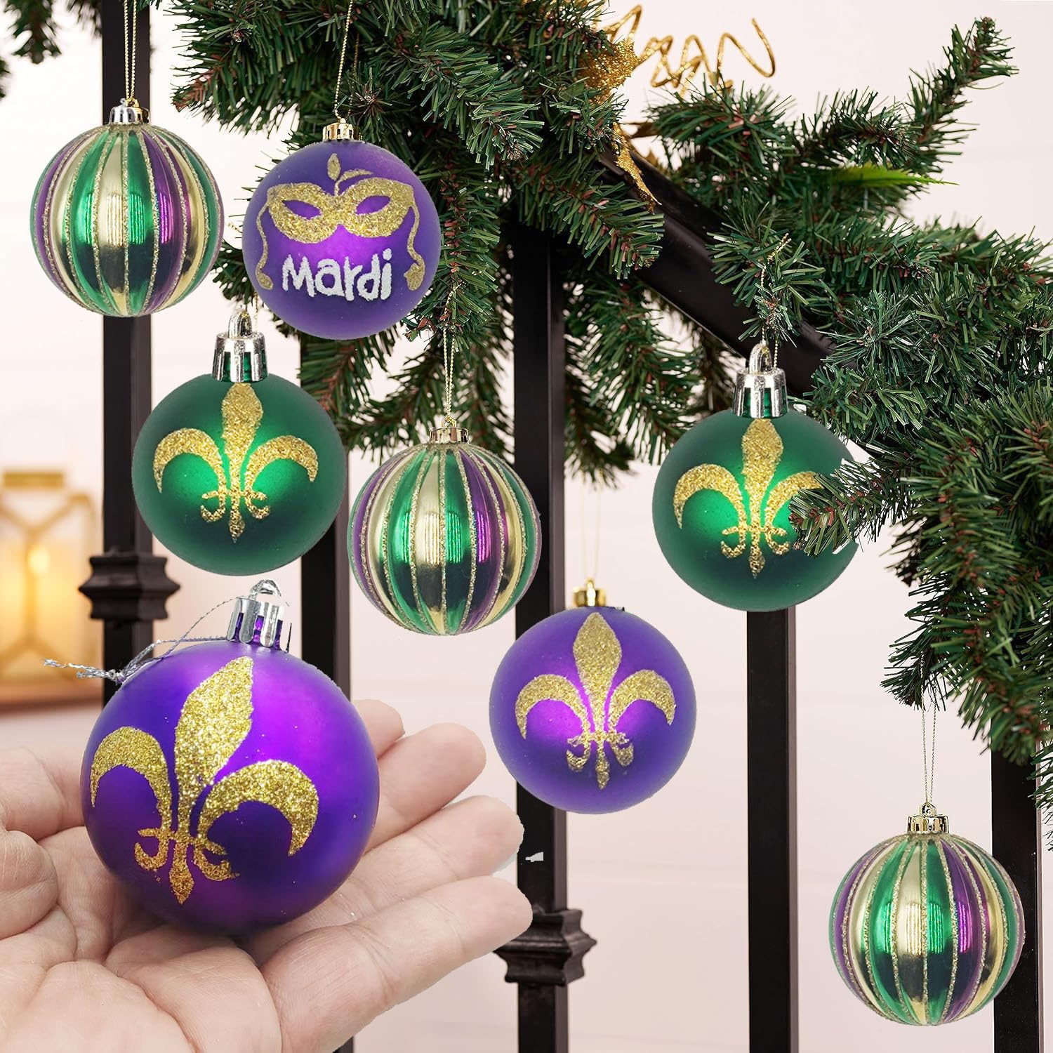 24 PCS Mardi Gras Tree Hanging Ball Ornaments-2.36 Inch Mardi Gras Shatterproof Ball-Purple Green Gold Tree Ornaments for Mardi Gras New Orleans Masquerade Party Decoration
