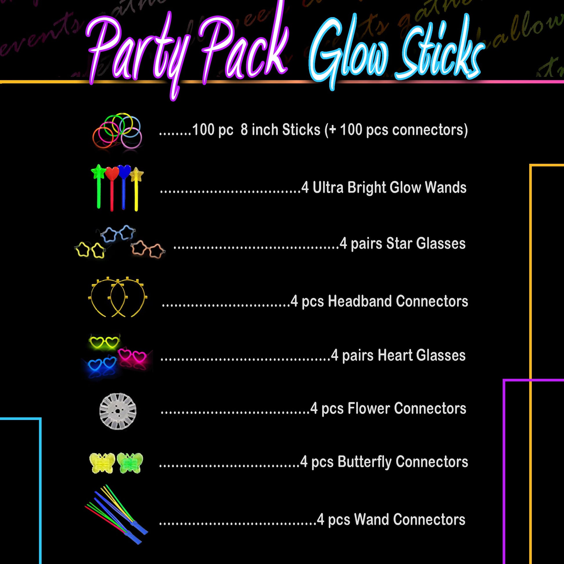 - GREAT VALUE GLOWING PARTY PACK: includes100 Pc 8-inch sticks (100 pcs connectors), 10 pcs ultra-bright glow sticks, 8 pairs glasses connectors, 6pcs headband connectors, 8 pcs triple connectors, 4 pcs flower connectors and 4 pcs butterfly connectors. Perfect for parties and decoration!
