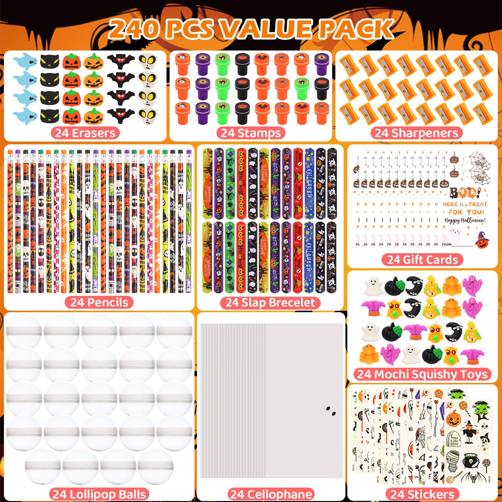 Details: Large Quantity Halloween Party Supplies: You will receive a total of 24 Giant Lollipop gift, include 24 Erasers, 24 Stamps, 24 Pencils, 24 Sharpeners, 24 Stickers, 24 Gift Cards, 24 Lollipop Balls and 24 Mochi Squishy Toys, such a rich combination is enough to meet your Halloween party or classroom exchange gifts needs.