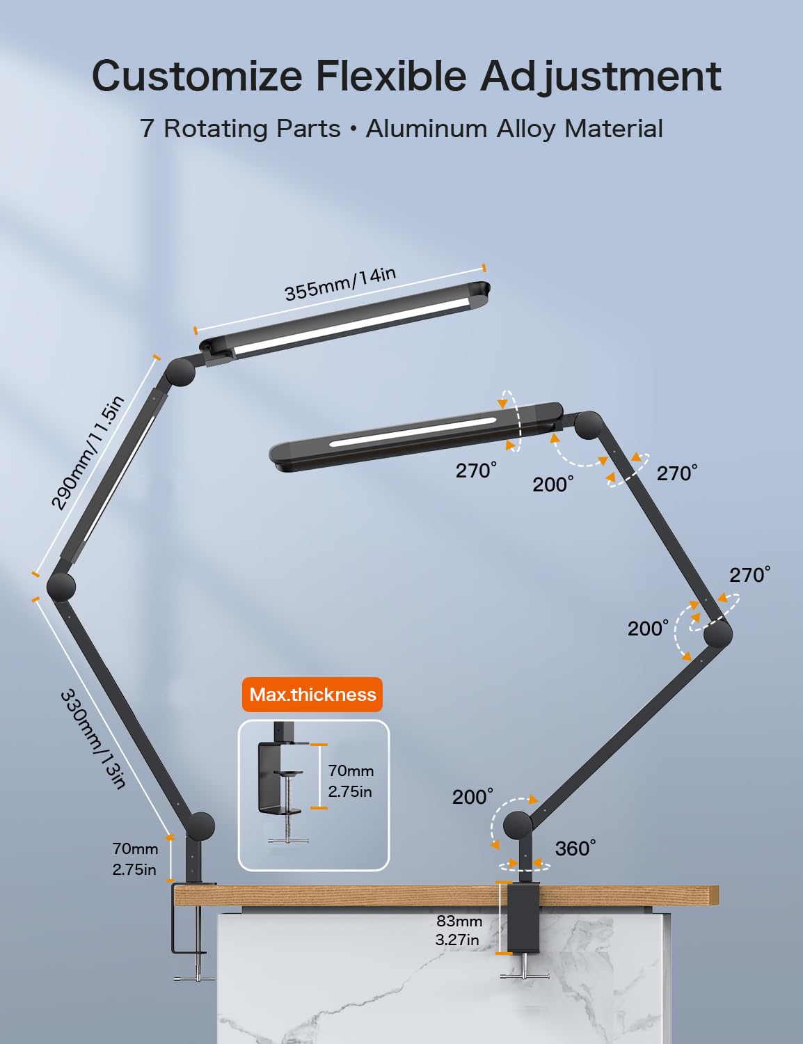 - Adjustable Swing Arm & 7 Rotating Parts:Super flexible swing arm desk lamp allows you to position the light in any direction you need. The light bar has 3 parts that can be rotated by 270°, 3 sturdy pivots that can be moved by up to 200°, and a clamp base that can be rotated by 360°. The clamp on desk lamp with ultra-wide clamp and silicone pads saves your workspace fits desktop/tabletop up to 2.75 inches.