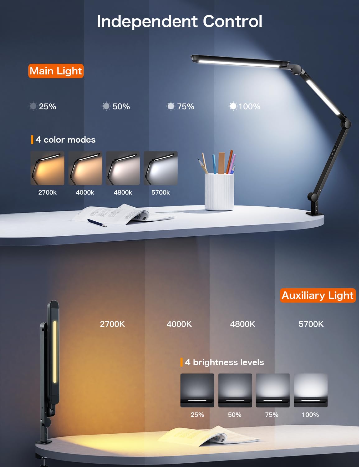 - Remote Control & Independent Control:The handy and flexible wireless remote control makes it easy to control the main and auxiliary lights independently. Both main and auxiliary lights have 4 dimmable levels (25%-50%-75%-100%) and 4 color temperatures (2700K-4000K-4800K-5700K). The clip on desk lamp has a memory function to remember your last brightness setting when you turn the lamp on and works with wall switches.