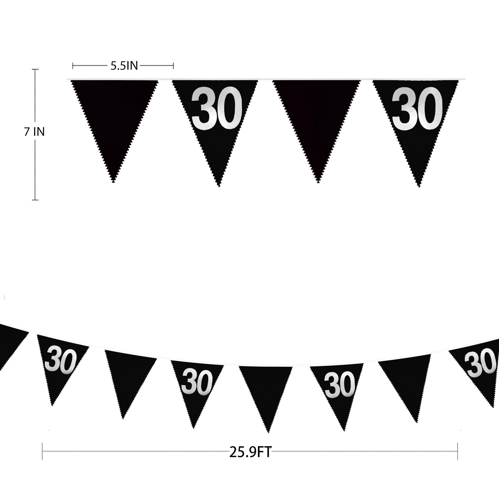 - Package Including:1 pack black silver fabric 30th birthday / anniversary bunting banner garland in metallic silver and black colors, with 28pcs flags in 8M/26Feet. Flag Size: 5.5in width x 7in height.